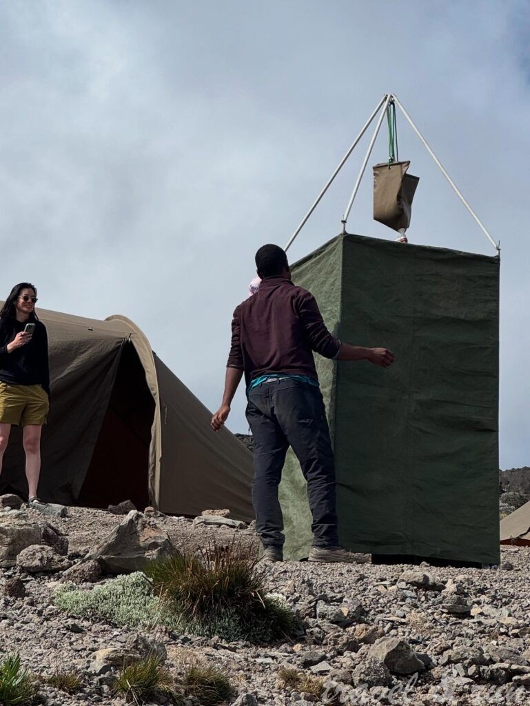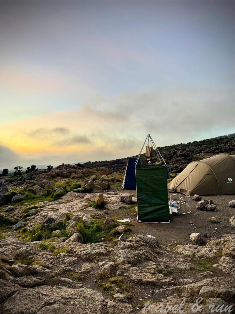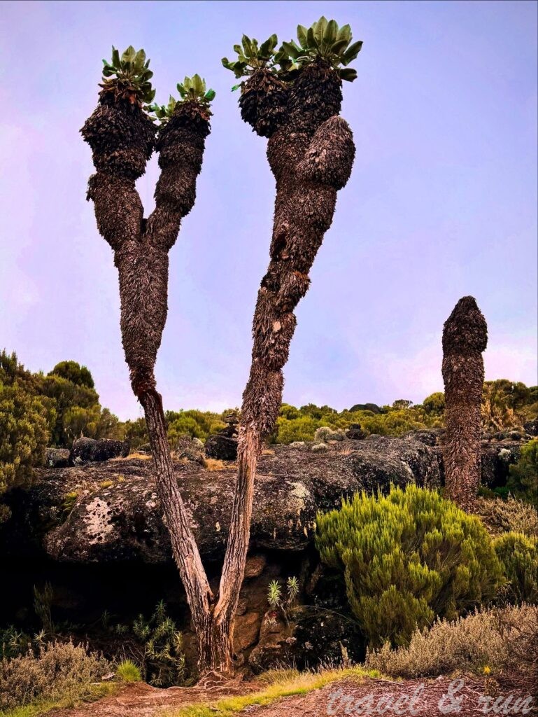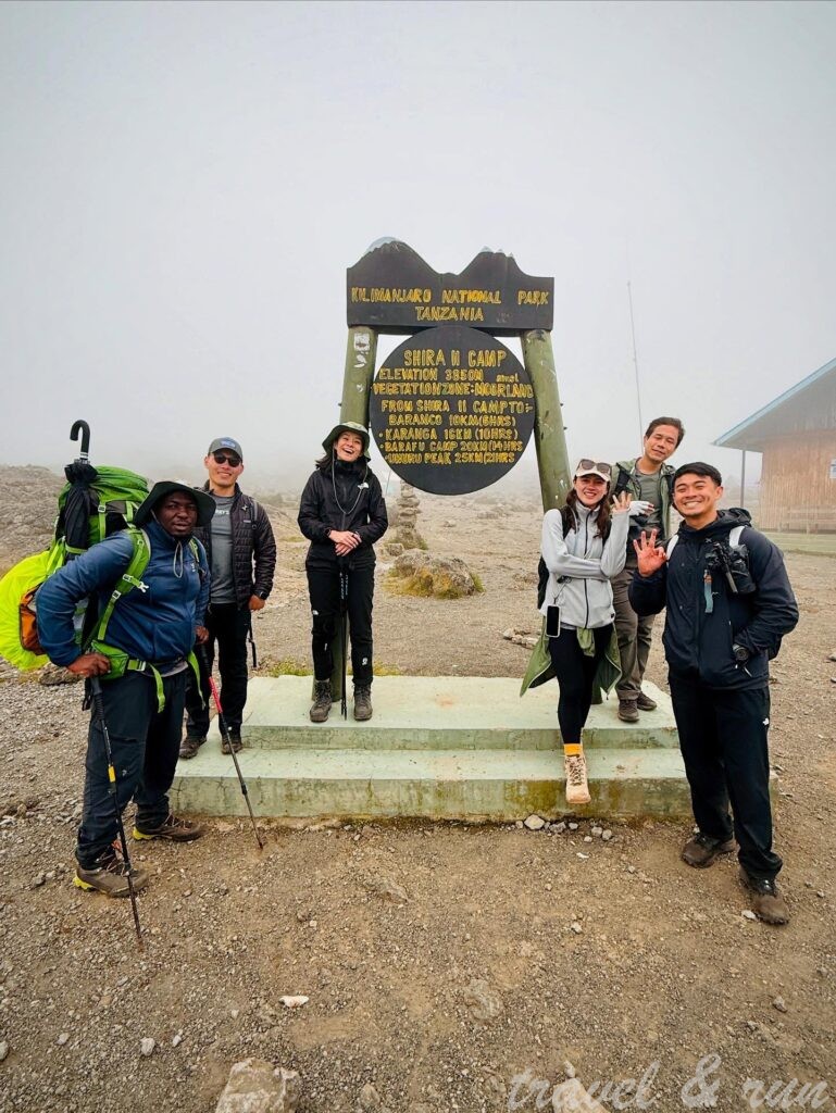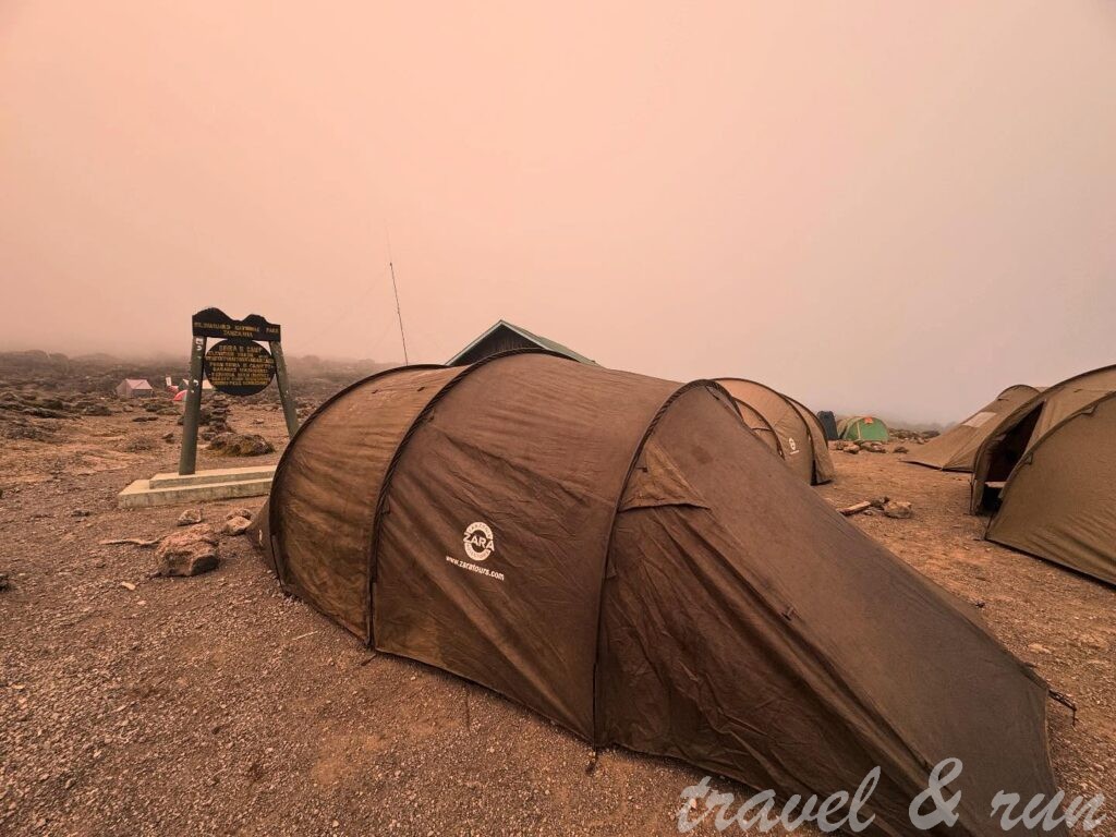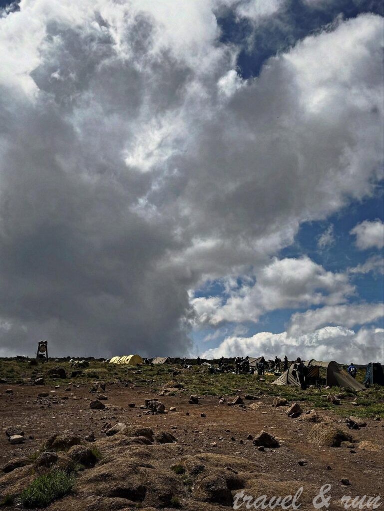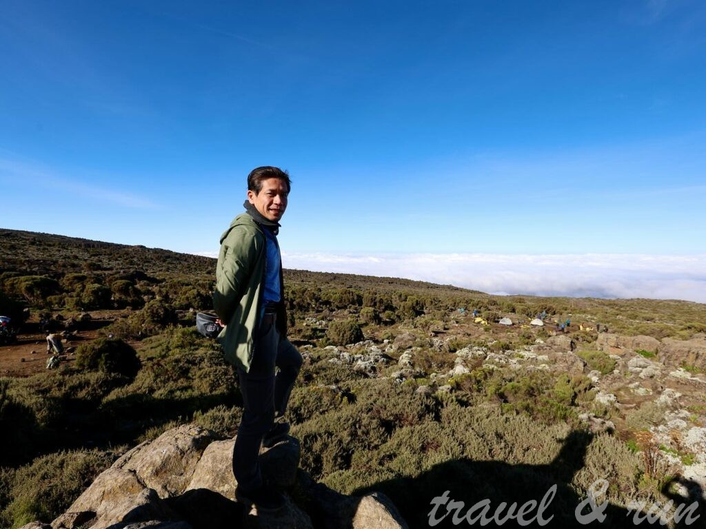 緩慢的上升中,四周的植被也開始越來越矮,是還有灌木、小草,但是越來越稀疏。然後在一個有水源的休息點,出現了一個奇特的植物: Giant Groundsels (正式的名稱叫做 Dendrosenecio )。Groundsels的中文叫做千里光,是一種菊科的草類,種子輕飄飄的結一個球狀飄散,跟蒲公英很像。但是在 Kilimanjaro山上的這個卻是巨大化的特有種,比較高的可達五六公尺高 (你可以想像一棵五公尺高的蒲公英嗎 ?) ,這種樹 (草?) 在東非的各個山頭,獨自演化出好多不同的品種,不同海拔高度,或是面像海或內陸,因為濕氣不同,也演化出新品種,但大致上的長相都有點像 (有種外星植物的感覺),雖然像是一棵樹,但是實際上是個巨大的草,風吹來真的還會隨風飄逸。過了這邊的休息點再爬一小段路就到了今天的終點 Shira Camp Two (終於!!!)。工作人員都已經搭好帳棚,準備好熱水給我們洗臉,今天比較有趣的是隊友有人想嘗試高山上野外洗澡 (雖然她已經在 5300M的喜馬拉雅山腳下洗過了,還有吹風機可以吹頭髮),但因為3950M的高山上實在有點冷,這時又沒有太陽只剩下雲霧中陰影下的冷風,邊洗邊冷到慘叫的聲音讓其他人都打了退堂鼓,等後天短路程的下午場再來洗好了。