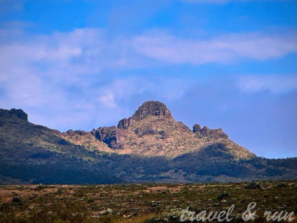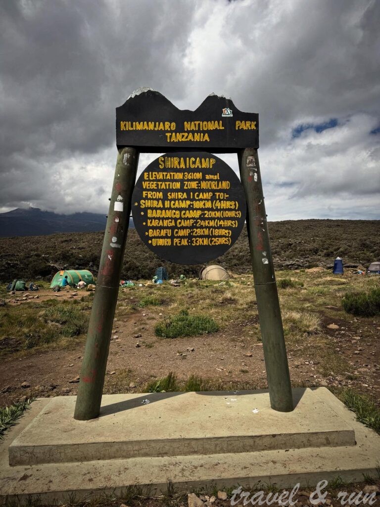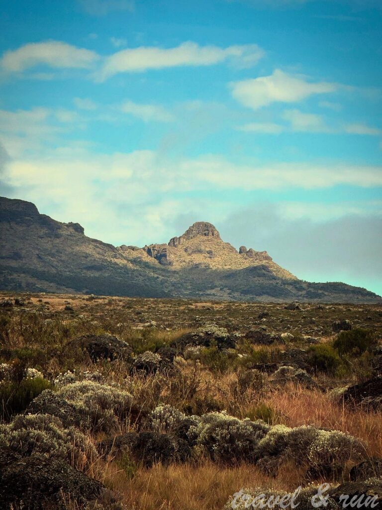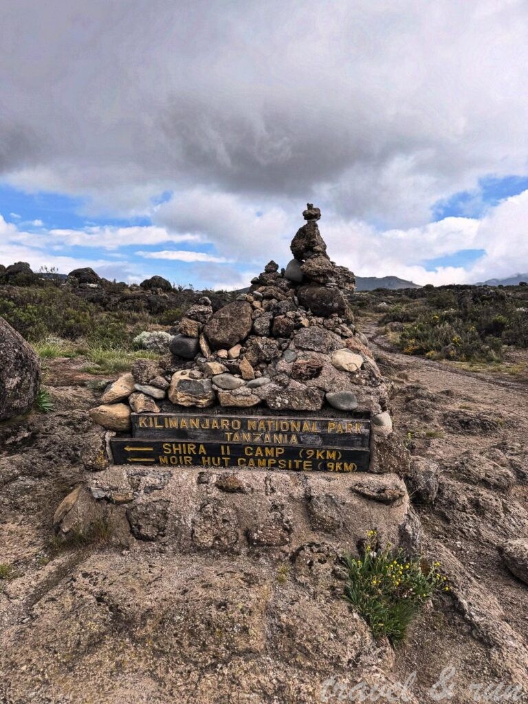 1.~4 在 Shira Camp One用餐過後,溯溪一小段,就又開始一個漫長的平坦高原。5. 在剛剛那個路標處,有一條路可以通到遠方的 Cathedral point (途中突起的那一個山塊)。會取這名字是因為他正面看有點像是一個教堂的立面,豎立在 Shira高原上。