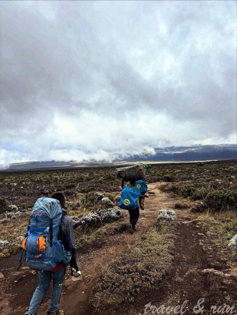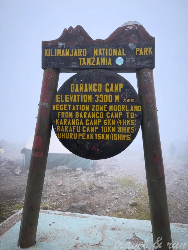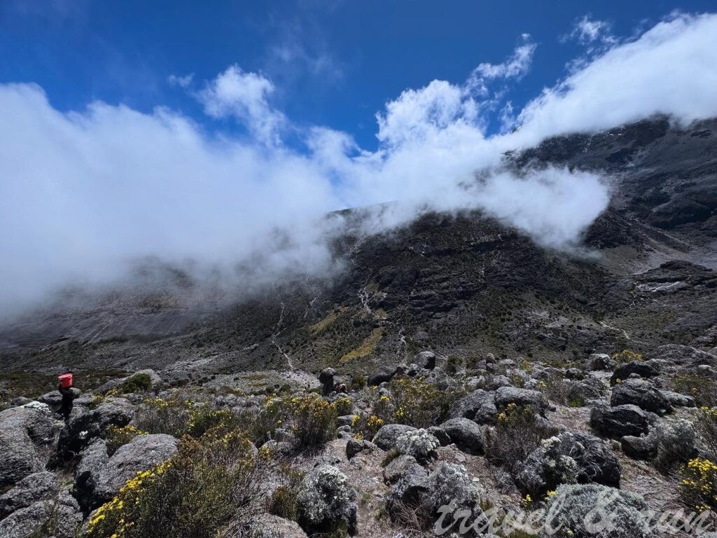 在 Lava Tower camp 吃飽喝足即將進入 Food coma之前,Ahmed進來午餐帳提醒大家還有一段路要走,不要睡著了。但是在背包上肩準備開始走時,就被眼前的下坡路驚嚇到,想說不是跟我講今天路徑都算簡單的,怎麼給我搞這種攀岩般的下坡路,但竟這裡是 Lava Tower,要離開一個 Tower好像本來就不會太簡單。還好 20分鐘左右走完這起頭最難下坡路,後面相對就是比較正常的的下坡路了。今天下午是 3km的路要下坡 640M,但除了最前面一段以外,之後大部分都算是緩下。從沙漠地貌走著走著,草漸漸變多,右手山谷的另一側也出現一些挑夫,是從剛剛的岔路口那邊,在不經過 Lava Tower下,直接往 Baranco Camp去的捷徑 (比較短,但是一樣要翻過一座山脊),周遭幾條道路都是下坡,最後會合在一團雲霧之中。這裡一邊走,一邊就又出現昨天看到的那種巨大化的野草。不過今天這邊的外觀稍微不太一樣就是了,看起來比較粗大(不確定是不是同一個物種),樹頂比較多顆花,一邊走一邊雲霧越來越濃,一群人走在這種外星植物般的迷霧森林,感覺還滿有趣的。最後半小時的外星迷霧森林路徑就這樣越來越平緩。因為不用曬太陽,大家心態上沒那麼厭世,跟隊友邊走邊聊著就這樣默默的來到了今晚的營地 Baranco Camp (3960M)。今天到這邊有點晚了,雖然這個營地有充足的水源但是導遊不建議我們洗澡,想要洗可以明天再洗,因為明天預計午餐過後就可以休息一整個下午了,會有充足的時間發呆打混。熱情的Selic一樣給了我們一盆熱水梳洗一番,我依照慣例,繞了營地一圈找到了 Cellular spot (在廁所旁邊,味道有點重)收發一輪訊息後就去休息等晚餐了。
