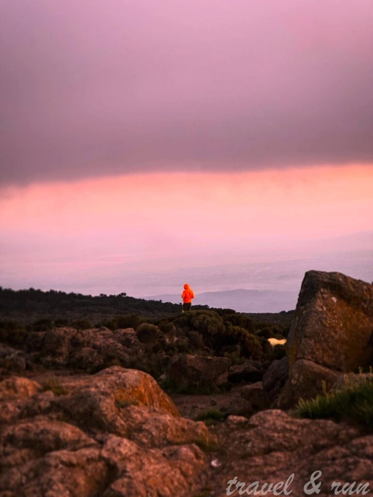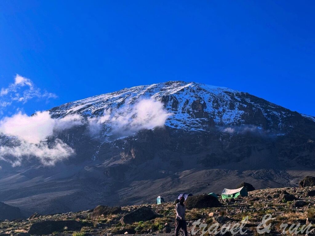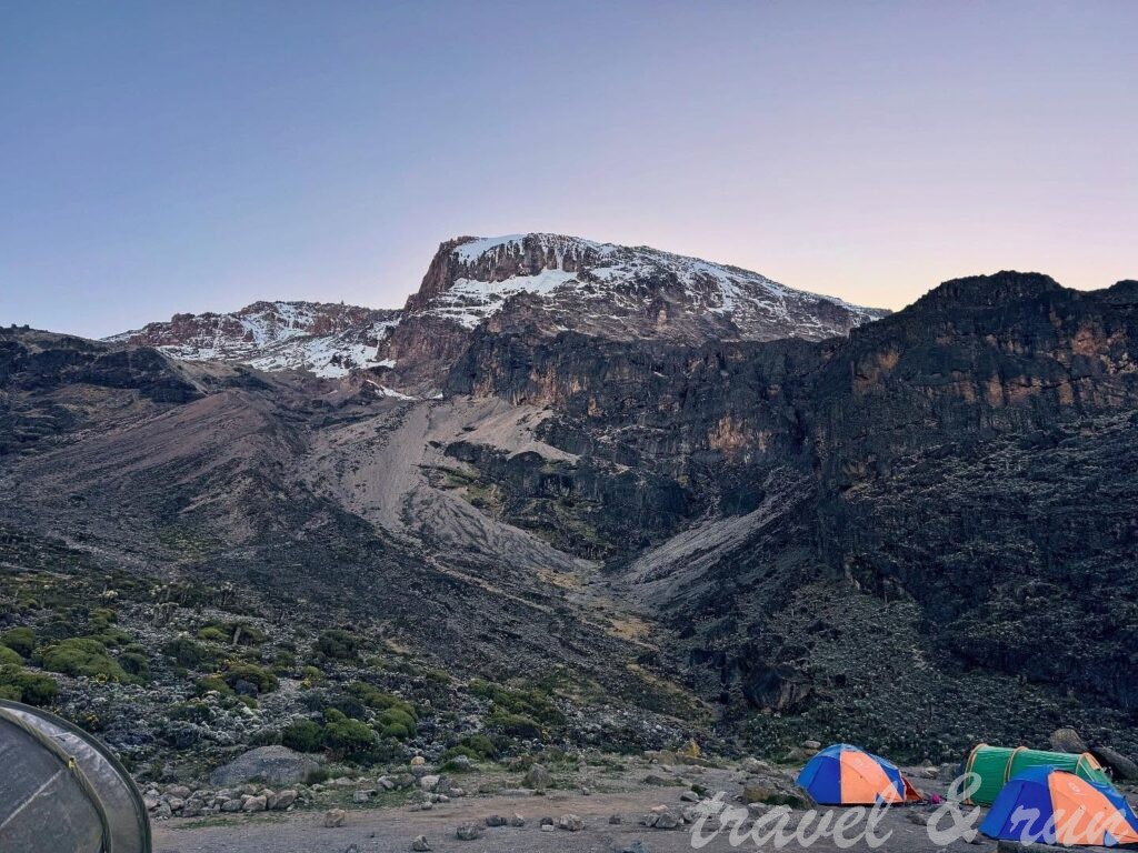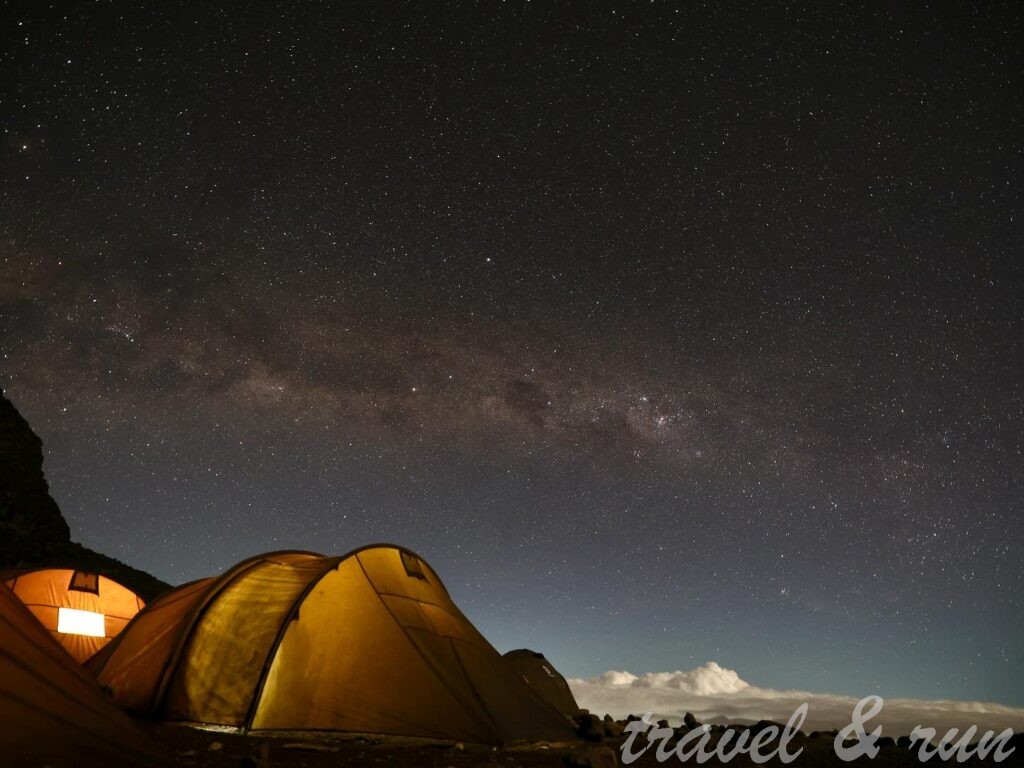 這天真的很累,走得很厭世,大家吃完晚餐就早早去睡了。但半夜起來上廁所的時候,我看到了一隊發光的東西我楞了一下,想說這麼高應該不會有螢火蟲,結果定下神來才發現是一對眼睛在瞪著我,但他看一下就繼續往前走了。隔天早上問了導遊,他是說類似狗的動物的話,應該是 Jackal (胡狼或豺狼),不過他們幾乎都是吃腐肉剩菜,一般來說擔心,就當作路人走過去就好,牠們主要是夜行性,一般來說除非你帳棚裡有剩肉被他聞到,不然也不會跟人類相遇,半夜上廁所沒有帶手機就是了,沒照下來。不過睡前倒是有欣賞一下銀河跟背後的 Kibo火山錐。