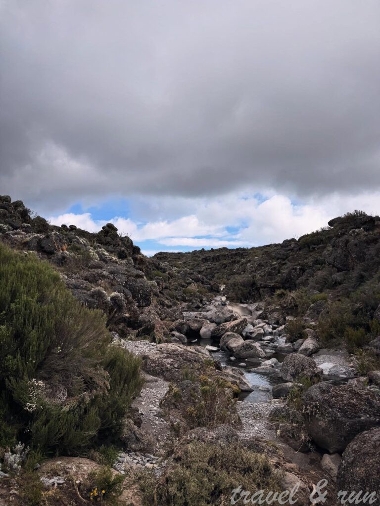 這邊有手機訊號,都市人在此停留頗久 (要傳什麽圖片文字訊息都處理一下),跟雲海合照了幾張後,就開始今天後半段的下、上、下、上路段 (總共翻了三個山峰就是了)。接著的緩下、緩上跟昨天的 Lava Tower一帶很像,一路的礫漠地貌偶而有稀疏的幾撮矮草。比較不一樣的是這邊看到很多明顯的冰河遺跡,事後查了一下,南側這一面的 Kibo峰總曾經共有 12條冰河,但現在除了山頂那邊的Furtwangler Glacier, Balletto Glacier 跟 Diamond Glacier 這三個還算有殘留大約 15%以外 (相較於 1912第一次看到他們的時候),其他冰河不是已經完全消失,就是指剩下散落的幾塊冰塊在各地,即將消失不見(稍早的營地那邊山谷,也有個跟他同名的 Barranco Glacier,但是現在止剩下山頂還有幾塊冰)。這邊上下起伏的坡度都算大,而且往上、往下都很明顯的感受到植被的變化 (走著走著,一下子跟沙漠一樣,一下子又變成小森林)。在最後一個山谷,就陡然下降很多了,這邊山谷底是一條清澈的小溪,水流強勁,想必山上那些消失的冰河冰塊都融化到這邊來了吧。在谷底稍事休息後,最後衝一波就到了本日終點 Karanga Camp,差不多剛好是午餐時間,接著有一整個下午的時間可以發呆聊天,還有充裕的時間可以洗澡跟睡午覺,好好享受這個難得的夏日午後。