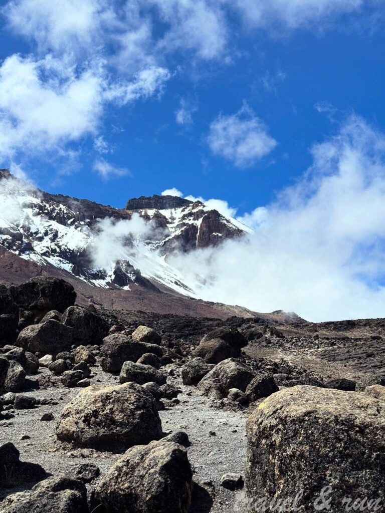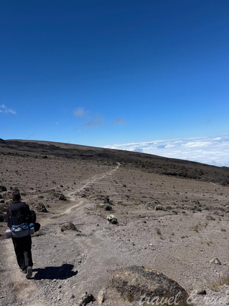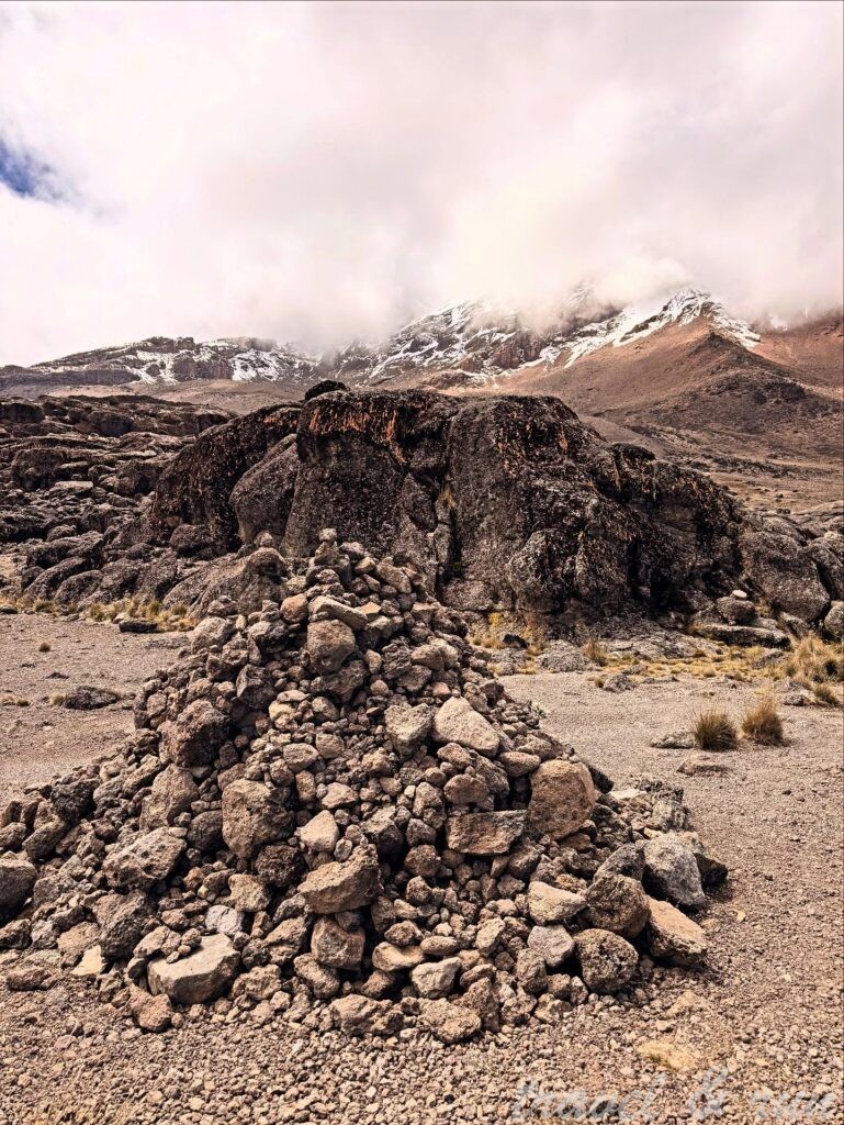 一開始起步就是上坡,上午總共6km要爬升750M,但是其實爬升最多的是在前半段,差不多爬到有四千五了,接著就是礫漠中繞著 Kibo的山腰外圍,緩下緩上的反覆一直前進。地貌上除了一開始還有矮草以外,後面就全部都是礫漠地貌,都是石頭,只有大顆跟小顆的差別。這段路邊走還一邊看到不少冰河地形的遺跡 (網路文章爬了一下,據說這邊十多年前還有一個 Arrow Glacier,但是現在已經不見一塊冰,只剩下冰河流過的痕跡了。)