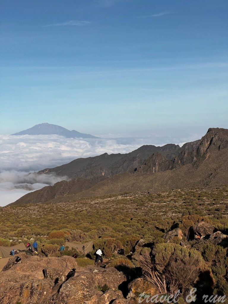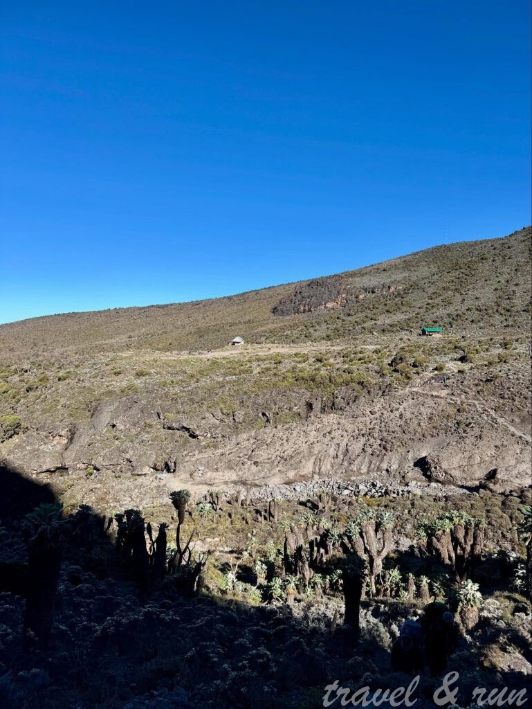 (左圖) 到 Shira Camp 2之後,回頭望剛剛最後一段上坡路的情況。走的時候只感覺厭世,但回頭一看才覺得還滿高的…..(右圖) 經過漫長的一天終於抵達 Shira Camp Two, 結束本日行程。