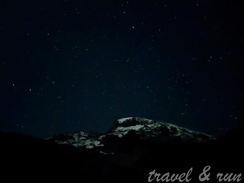 - 這是在 Shira Camp 2晚上對著 Kibo照的照片,月光下的雪白山峰與滿天星斗。除了冷以外,沒什麽好抱怨的。