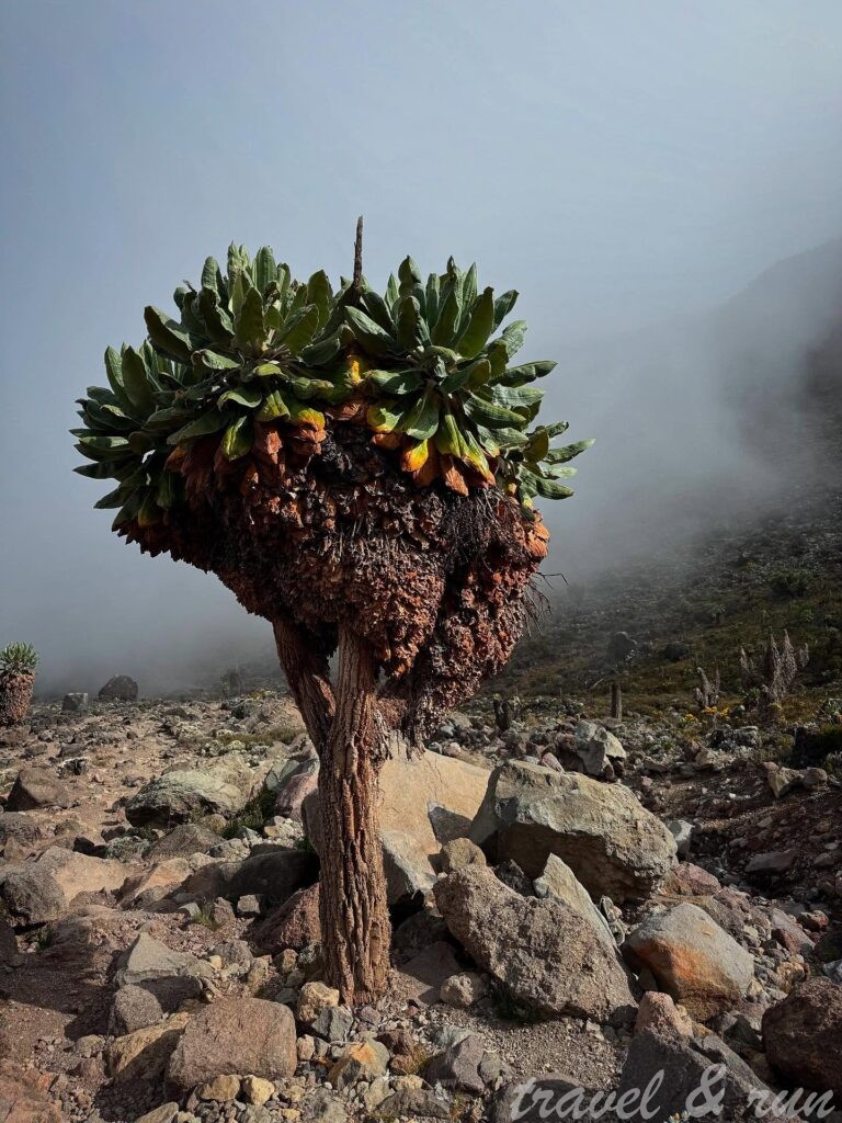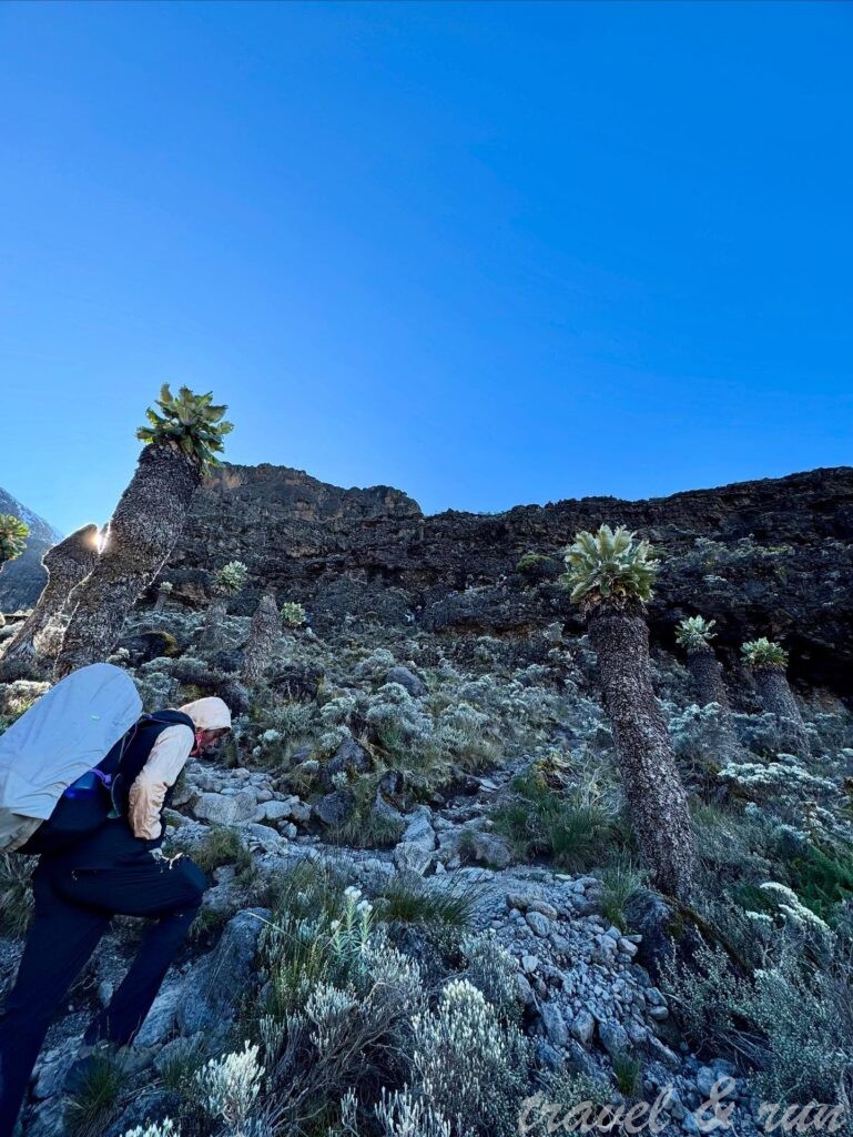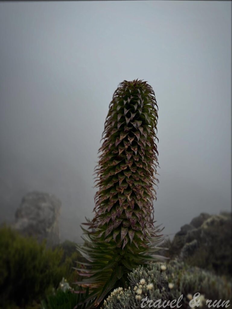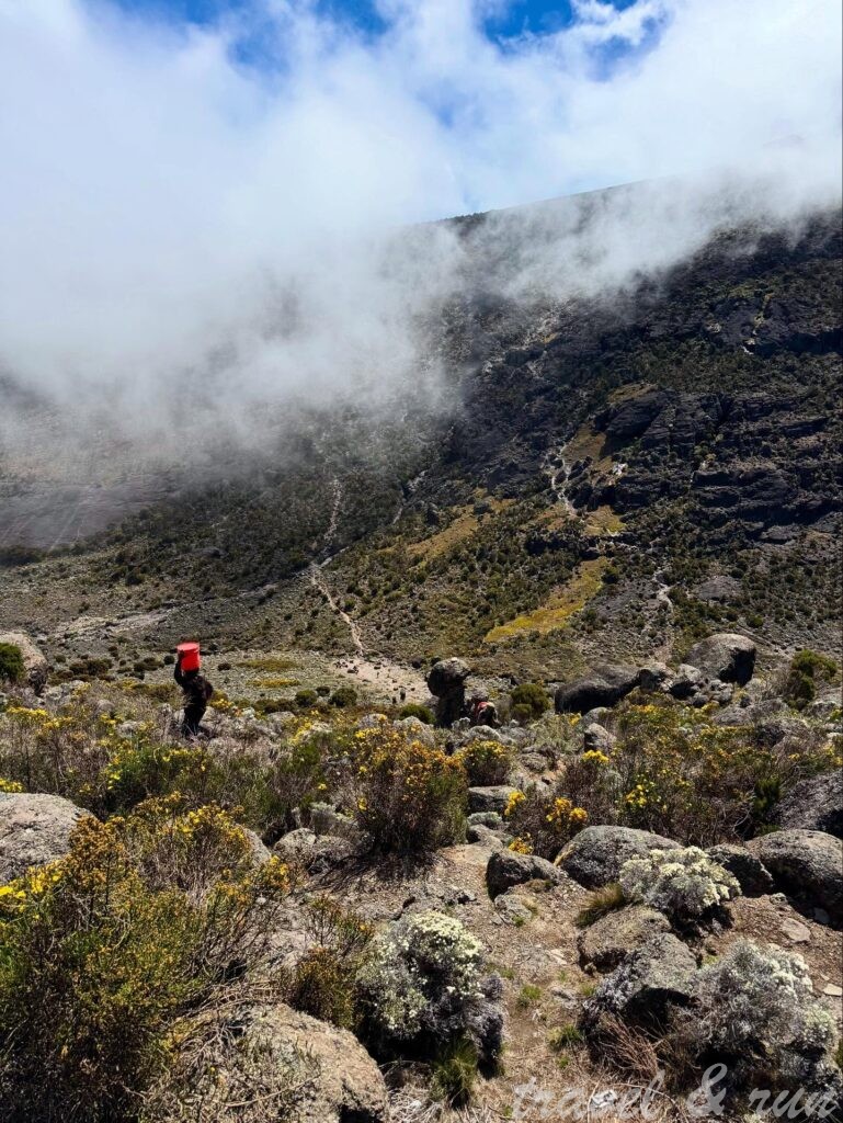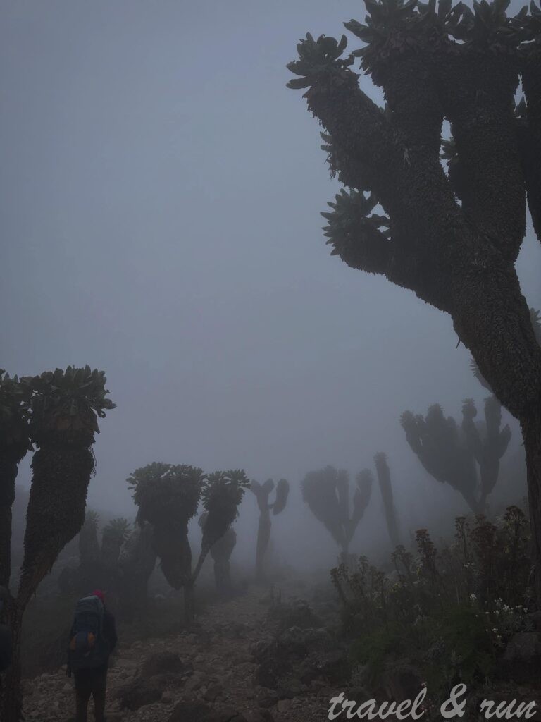 - 下坡到大約 4300M海拔左右,就開始看到前面有一層雲霧,以及昨天的巨大化野草 Giant Groundsels一棵一棵的散落在整個山坡上。