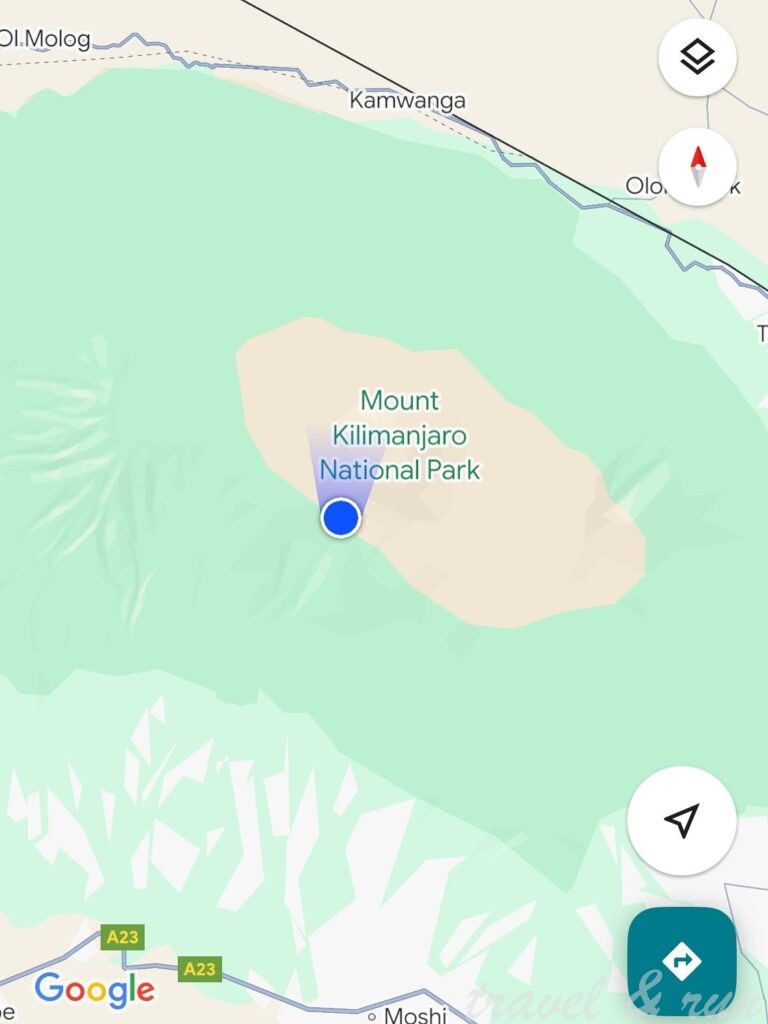 - 截圖說明一下今天的營地位置。今天一天差不多就是從地圖上土黃色區域的左上角,繞到左下中間。距離第一天在本地圖左側之外的Lemosho gate 已經非常遙遠了。