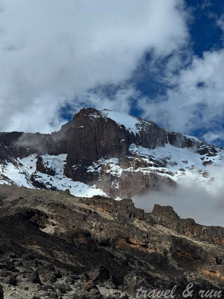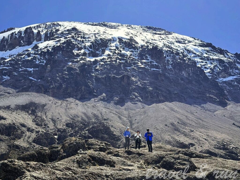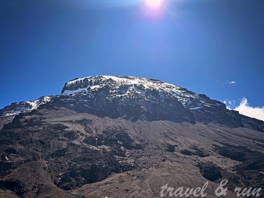 - Barranco wall山頂望著 Kibo火山錐。可以明顯的看到好幾條曾經存在的冰河的痕跡。2. 休息了好久,但該面對的還是要面對,繼續後半段行程。