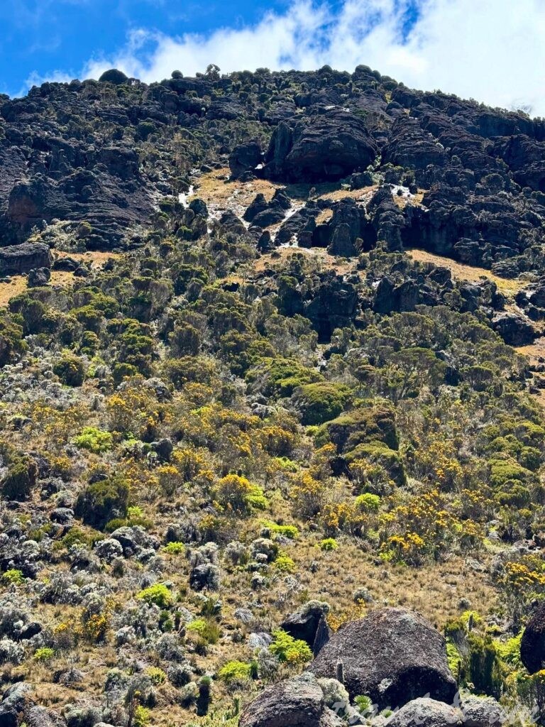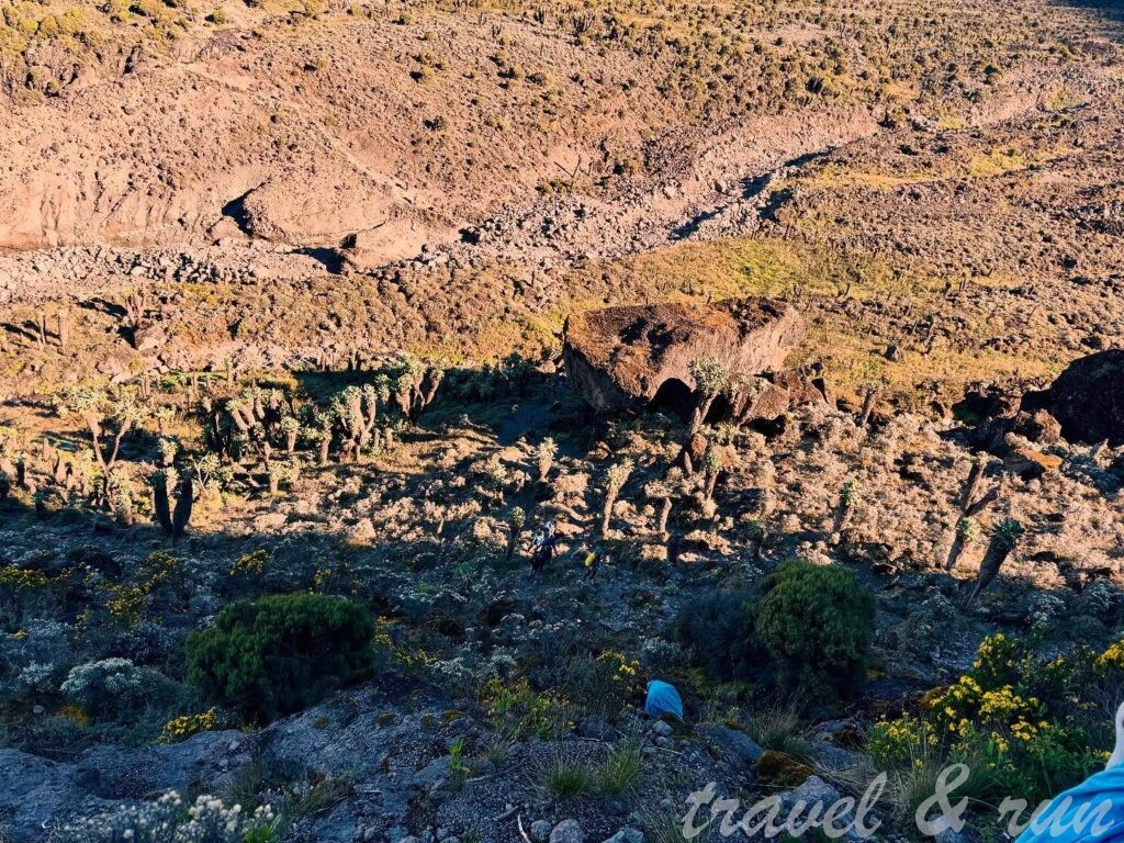 一早用餐完畢,繼續跟著 Ahmed穩定而緩慢的步伐慢慢前進。最前面一段很平緩,然後緩緩的漸漸有點高度上升,這邊都還是在森林裡面,跟台灣的山上在走的路很像。但走了大約半小時,就會發現森林的遮蔽比較少了,然後再大約15分鐘,Ahmed回頭跟我們說,森林結束了 (Google map定位在這邊),前面變成高草原了,要遮陽要防曬的這邊休息一下處理處理。這邊開始還是繼續緩緩的上升,但地面明顯的變成乾土跟石頭,兩邊還有大約一人高的植物,但是沒有什麽遮蔽了。又走了不知道多久之後,植被越來越矮小,遠方的草原都看得清清楚楚,我們眼前演變成矮草原,接下來要走的路也漸漸明顯了。這邊已經是山頂高原了,大約3500M左右,平平的往前進 (真的很平,甚至有一點下坡),這段路其實有點像是 Arizona 或是 New Mexico的矮草原 (美劇breaking bad 影集他們常在野外露營的那種莽原)。因為很平坦,遠遠的就可以看到午餐地點 Shira 1 camp(還是有點遠),跟只有一個小白點的 Shira Camp two (遙遠的山坡上,非常小的一個白點),看得到目標但是他們又好遠,也不知道是該笑還是該哭,大家就繼續默默的往前就是了。這邊大約 3500M高,太陽時有時無,但不是太曬,氣溫也還好,累歸累但還能前進。