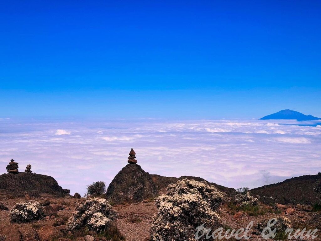 昨晚睡得滿好的,早上起來先是對著雲海發呆了一下 (又是雲海搭配 Mt. Meru的標準配備),回頭看了一下那個難以征服的 Kibo火山錐這面的峭壁,又在想這真的是有路可以上去嗎? 離開營地先是經過了幾條小溪,越到山谷的另一側之後,開始緩緩的上升,這裡可以看到早上的營地已經是個遙遠的小建築物,但就算爬了這麼高,也才爬升一半不到,接著就開始要面對稍早在營地有看到的一面高牆: Barranco wall。 這裡要在接近垂直的情況下爬升 257M公尺 (不過不是真的攀岩,就是很陡峭的手腳並用路徑)。中間經過一個 Kissing rock (跟鹿港的摸乳巷差不多概念,就是經過這裡的時候人要貼著岩壁,所以自然就會跟這塊突出來的石頭 kiss了),在這段艱辛的上坡路大約一小時走完,迎接我們的在Barranco wall山頂的是一片壯觀的雲海跟還是遙不可及的 Kibo巨峰。