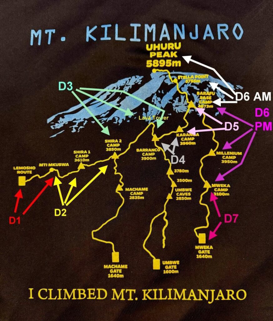 以下簡單寫一下接下來幾天的路程與爬升高度,爬升高度沒有包含上上下下的部分,僅寫起點、終點的海拔高低差。我們走的 Lemosho算是天數比較長的,基本上是從西邊的山腳下起登,到高原之後,在 4000公尺上下前進了好幾天做高度適應 (第二天下午就3850了,後面都一直3900~4600M之間),到第五天的半夜(第六天凌晨)才攻頂,相較其他有的五天就結束的快速行程,Lemosho算是一個用時間換取高山適應,提升登頂成功率的選擇。