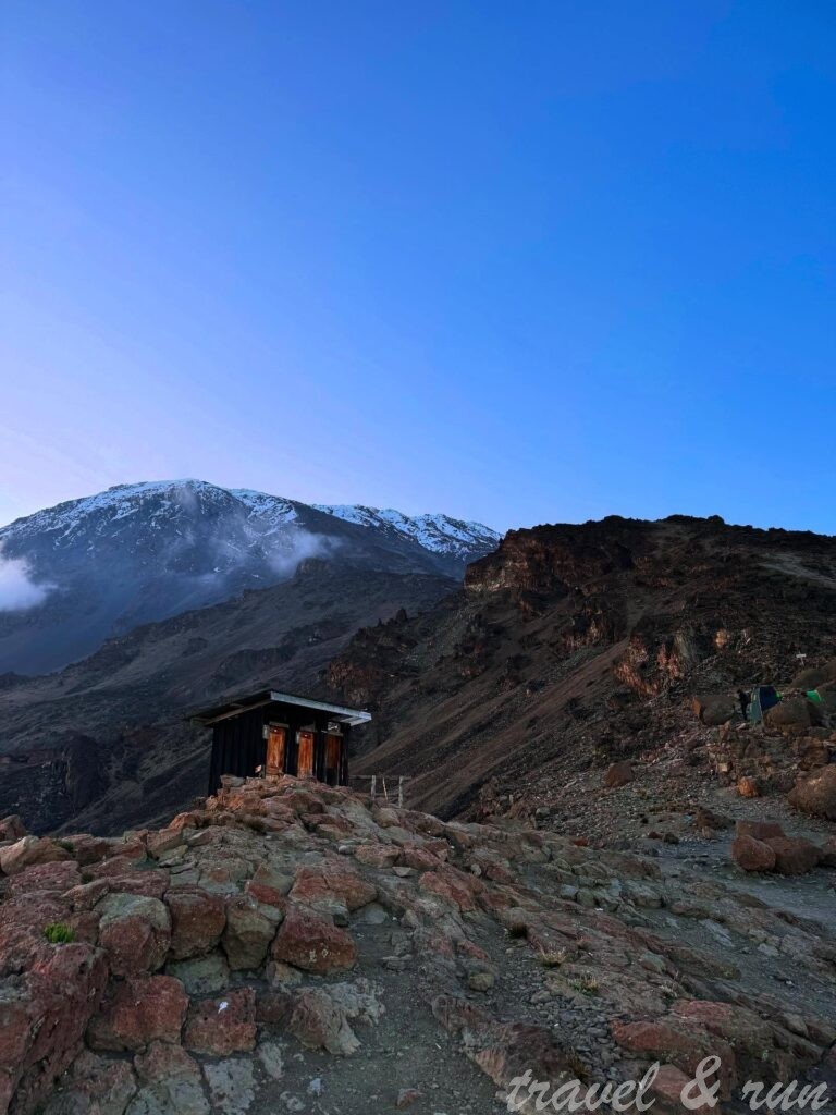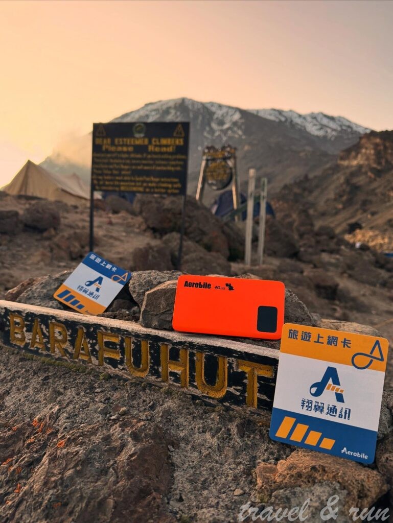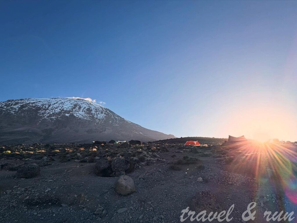 早上的的 Karanga Camp 還是一樣悠閒氣氛,配雲海風景吃個早餐,剛好是Kibo火山錐搭配日出的背景,欣賞了一下日出就開始沙漠爬升之旅半天 (大約爬升了600M),沿途越走越乾,從還有一些乾草到完全是石頭的礫漠。我們在休息的時候還看到幾個提早到營地的挑夫又回頭經過了我們,問了導遊才知道,原來今晚的 Barafu Camp基本上是個沙漠,沒有水源,所以他們要回去早上的營地再多拿幾桶水來給我們用 (我的媽呀, 單趟也是要 3.5 hrㄟ)。今天的坡度是 向上—> 平路 —> 向上兩段式爬升。不算太累,走著走著,默默的中午就到了攻頂的 base camp: Barafu Camp. 吃了一頓咖哩午餐後,導遊叫我們先去睡一覺,晚上才有力氣 23:00起床。但實在是睡不著,在帳棚裡滑手機回了一些訊息跟回信 (P.S. 這營地有大約1格的訊號,勉強可以做點事情)。勉勉強強睡了一小時,就又是 17:00起來吃晚餐,又被叫回去再睡一次。但實在難以 6、7點入睡。好不容易到不知道是 9點還是10點終於睡著了,卻又馬上被叫起來準備要起登攻頂了~
