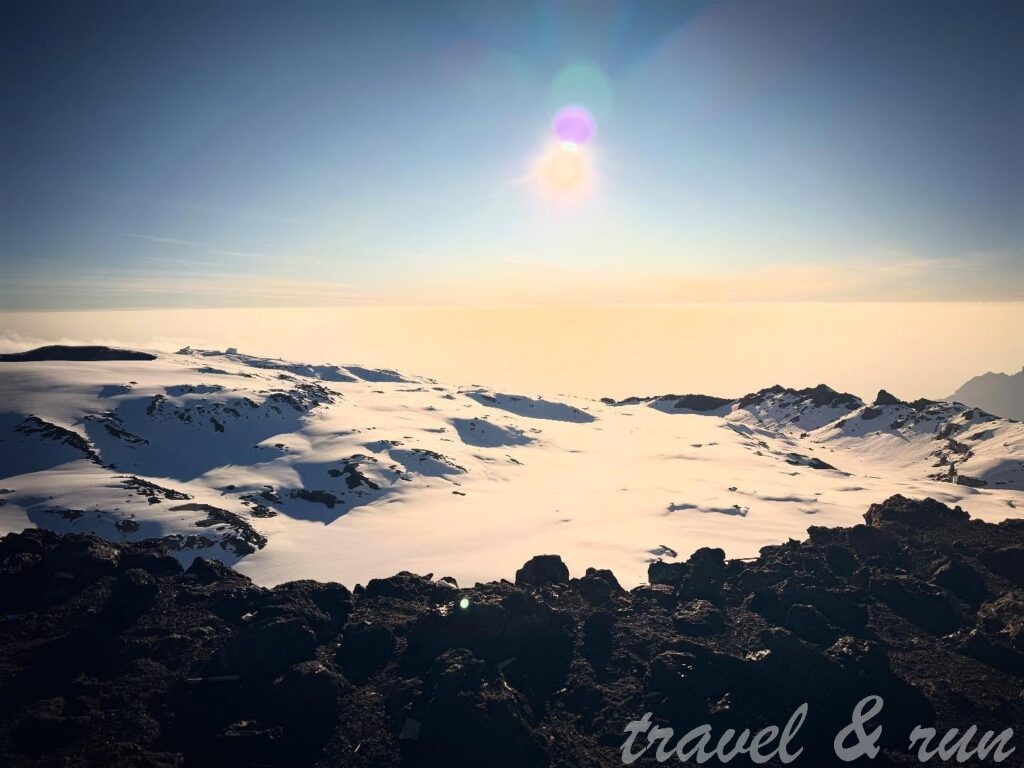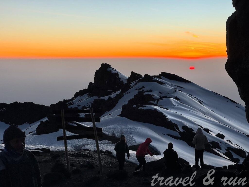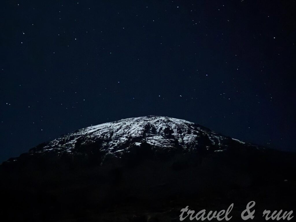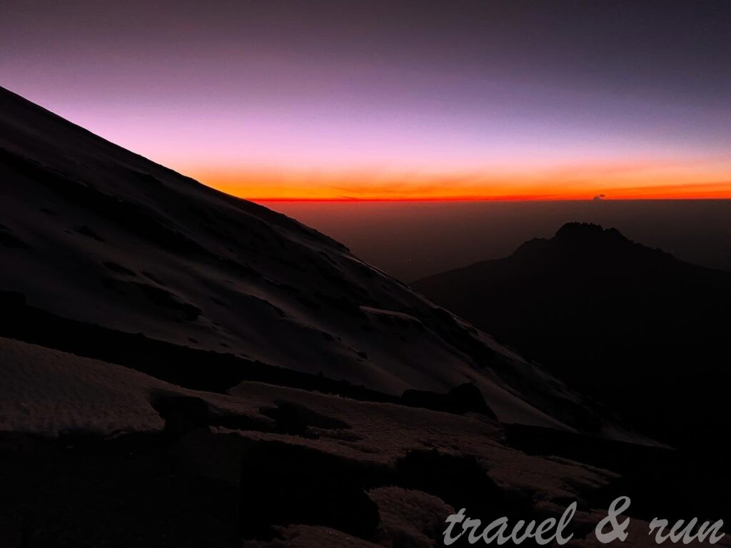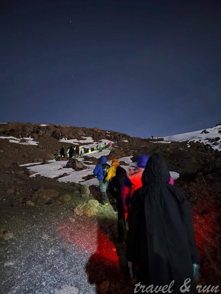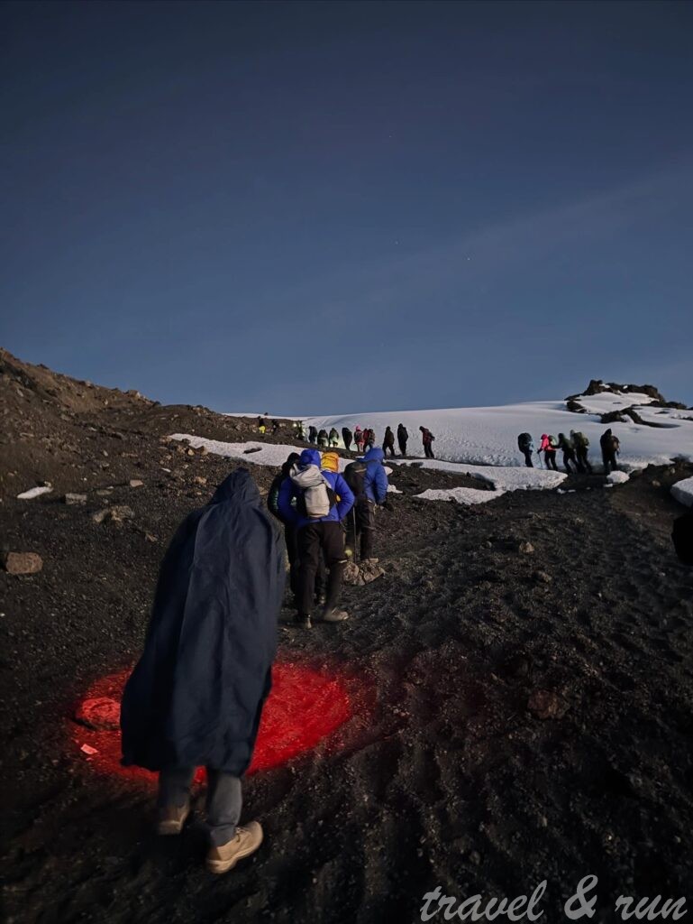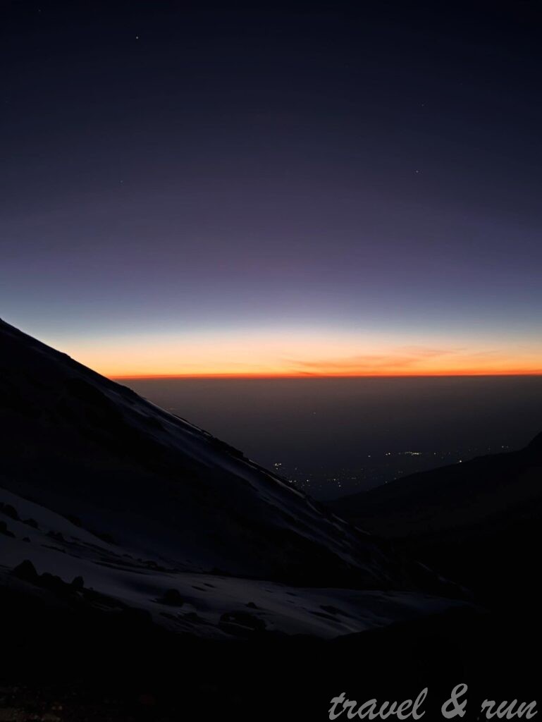 終於來到了最精彩的一天,晚上 11:00好不容易翻來覆去終於睡著卻又被叫醒,睡眼惺忪的整裡了保暖裝備,11:30到餐食帳裡喝幾杯熱飲,吃點餅乾補充熱量後,就準備攻頂了。12:00準時出發,大家看起來都是眼睛閉著在走路,一開始先是緩上,但很快坡度就慢慢提高,不過這邊都還是堅硬好走的路,大約走了 1hr 到了一個可以休息的空地 (有廁所,有人在這邊搭營,看來也是個營地),之後就開始比較難走的碎石路 (要小心滑倒),這邊沿途都烏漆摸黑的,眼前除了頭燈所照之處以外,其實什麽都看不到。天空跟遠方平地上的市鎮、農莊燈光倒是清晰可見。其實是後回想這一段路,感覺好像一片空白,一群人行屍走肉般的 zombie walk 根本不知道自己在幹嘛的緩緩上行了五個多小時到山頂,剛好趕上日出時分。(導遊 Salim後來說,挑這種時間攻頂,除了剛好可以看日出是個原因以外,更重要的是讓大家摸黑上山根本不知道眼前的路長什麽樣,不然可能看到這些路心都涼了,根本沒有動力向上。)