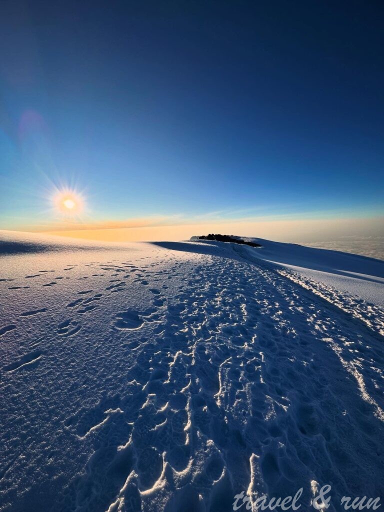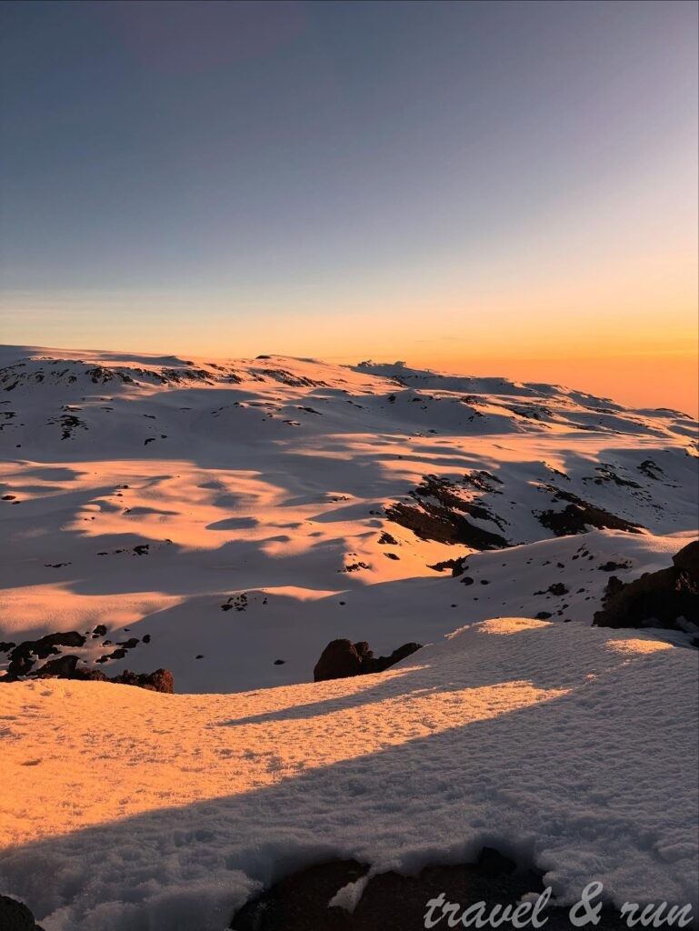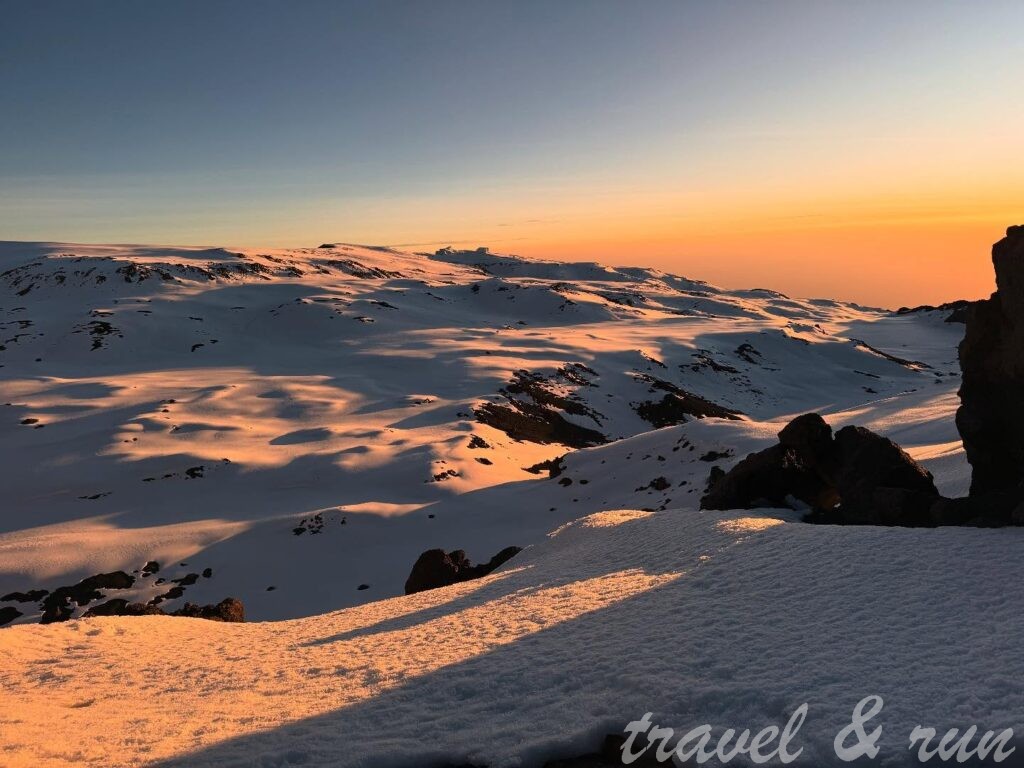 - 隔著白雪覆蓋的火山口,另一邊是火山口三個山峰中最矮的一個 Gilman‘s Point (5685M)。日出時分的陽光總是最吸引人,以跟地面接近平行角度的在雪地上切割出一塊一塊的陰影,害我沒辦法繼續走,只能停下來照幾張 (但是好冷不想伸出手來)。