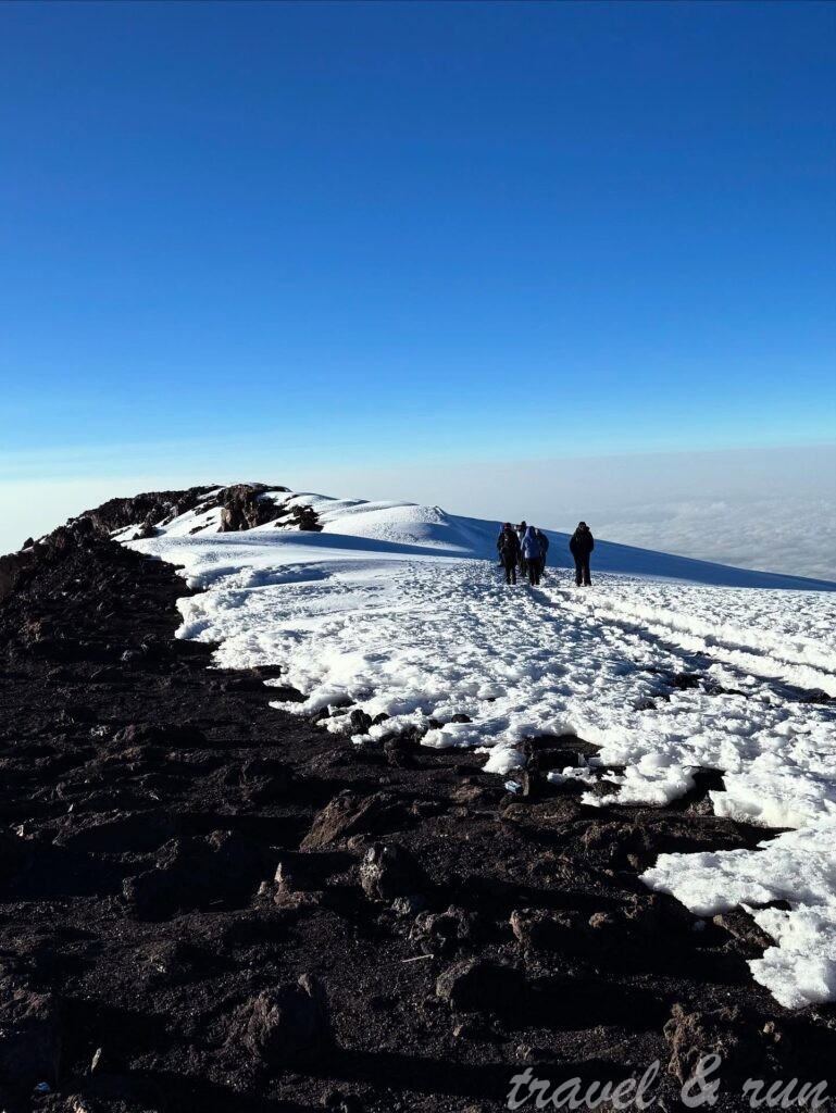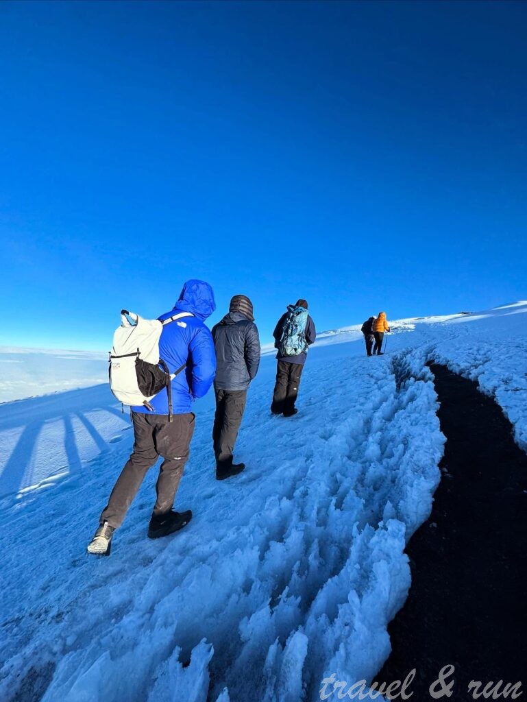 - 雖然不是什麽壯觀的照片,但是這張照片其實是站在非洲最高峰 Uhuru Peak回頭照的 (因為此時有人在山頂牌子那邊照相,我只好先在這邊等一下)。照片左側因為是火山口斜坡的向陽面,每天照光已經融化出一條路徑了。大家辛辛苦苦走了6天就是為了到達這一點,終於可以收工了。(圖片中間背光的剪影就是本登山團)