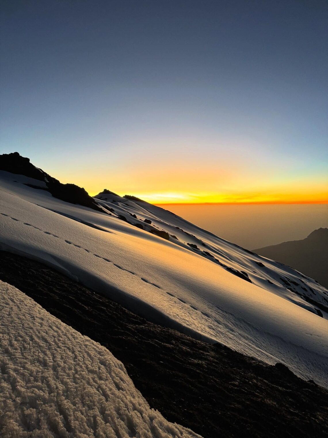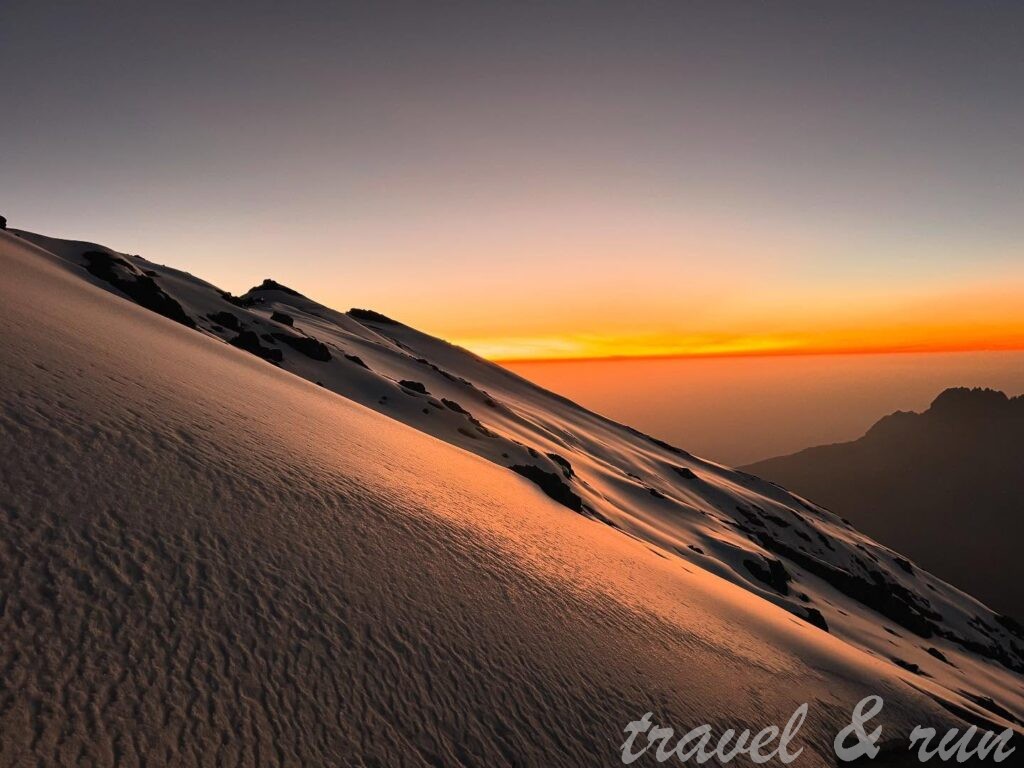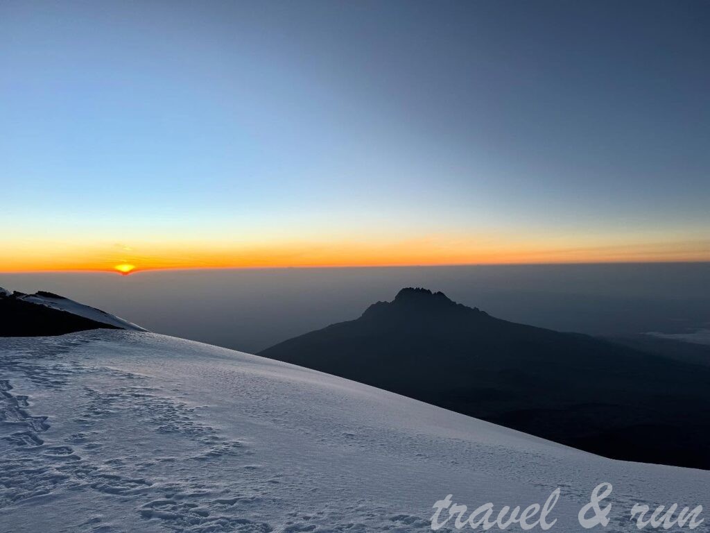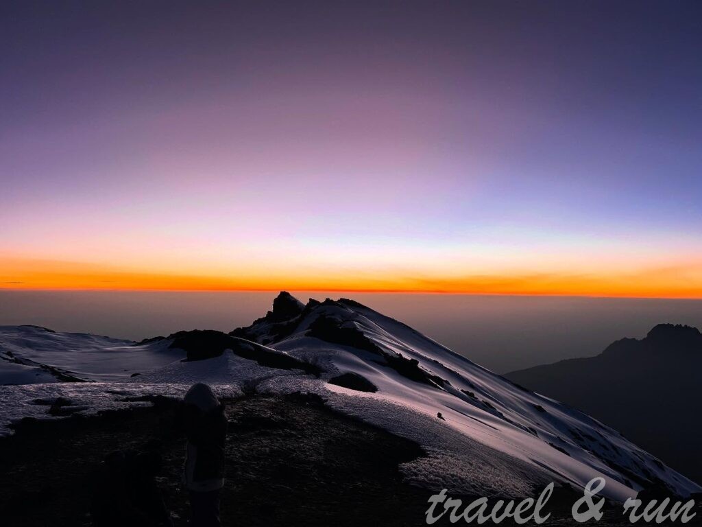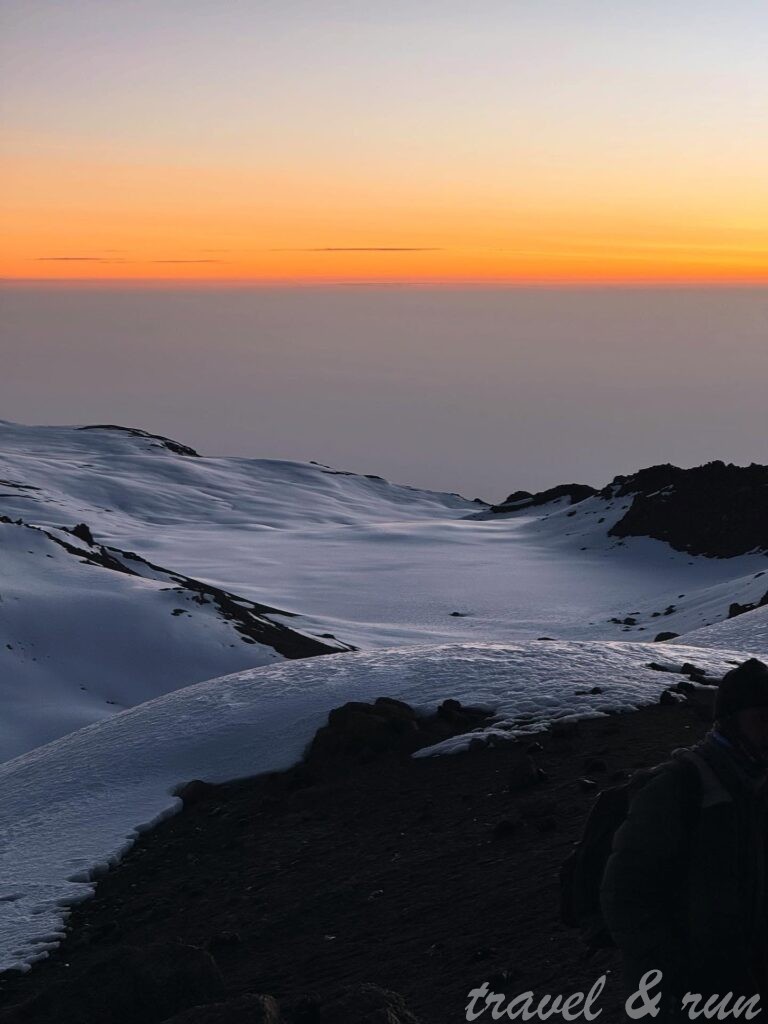 總之,歷經將近六個小時的疆屍般夜行軍,天空漸漸露出魚肚白,光照之下也漸漸看到原來路邊已經一塊一塊的散落一些積雪。最後在登上 Stella Point前的 20分鐘,天色亮到已經不需要頭燈的最後一段陡上 (感覺跟登富士山有點像,一樣都是越到上面坡度越陡,然後在快要放棄的時候就看到日出,陽光灑在眼前的山頂,眼前只剩那一小段路,陽光跟景色激發出的腎上腺素很快就把你叫醒,撐過最後一段路了。)