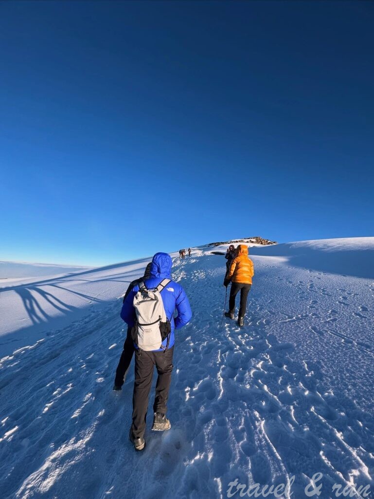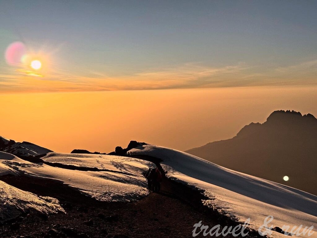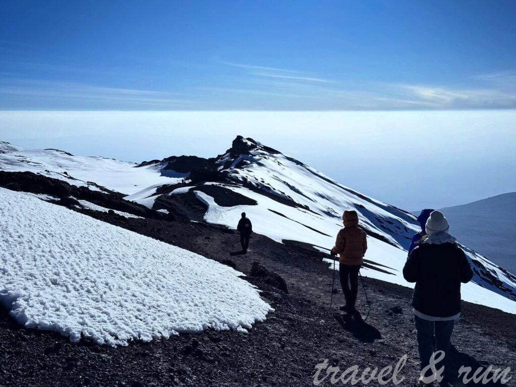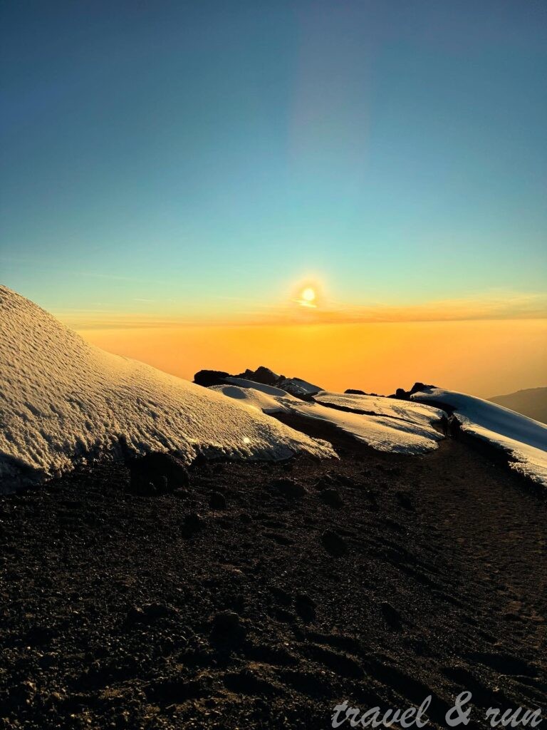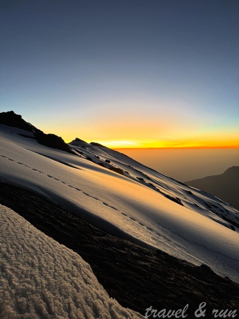 總之,歷經將近六個小時的疆屍般夜行軍,天空漸漸露出魚肚白,光照之下也漸漸看到原來路邊已經一塊一塊的散落一些積雪。最後在登上 Stella Point前的 20分鐘,天色亮到已經不需要頭燈的最後一段陡上 (感覺跟登富士山有點像,一樣都是越到上面坡度越陡,然後在快要放棄的時候就看到日出,陽光灑在眼前的山頂,眼前只剩那一小段路,陽光跟景色激發出的腎上腺素很快就把你叫醒,撐過最後一段路了。)