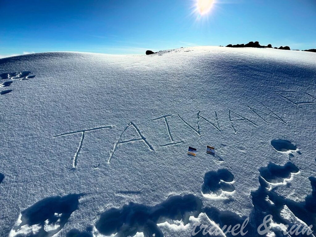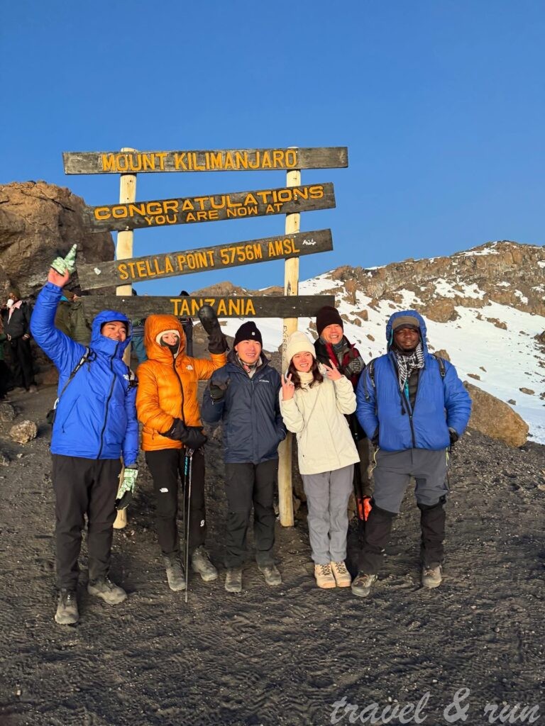 根據 Kilimanjaro發放登頂證明的吉力馬札羅公園官方的規矩,只要走到山頂的三個點 (1) Stella Point -5,756M (2) Gilman’s Point-5,685M (3) Uhuru Peak- 5895M 其中之一,都會發放登頂證明給你。這三個點其實就是火山口這個大圓圈的三個小山峰,類似富士山頂火山口巡缽一圈會經過八個山峰,但你不一定要到最高的劍峰,就可以得到登頂證明,畢竟都走到火山口這裡了,剩下的路其實相對平坦,你已經完成最難的路段了,恭喜你算是登頂了。Stella Point 是以 1925年登頂吉力馬札羅火山的第一位女性 Estella Latham 的名字命名的。這裡是來吉力馬札羅山眾多攻頂路線中,大部分路線的山頂會合點 (除了有一條從 Lava Tower那邊,看起來不太像是人能走的大崩壁路線,我看應該也真的沒人在走那條路),所以到這邊會看到從東邊另一條路(Marangu Route) 過來的登山客,一樣是一臉疲憊的樣子,在這邊互相鼓勵繼續往更高的 Uhuru Peak (5895 M, 還有 139M的高度爬升)終點前進。