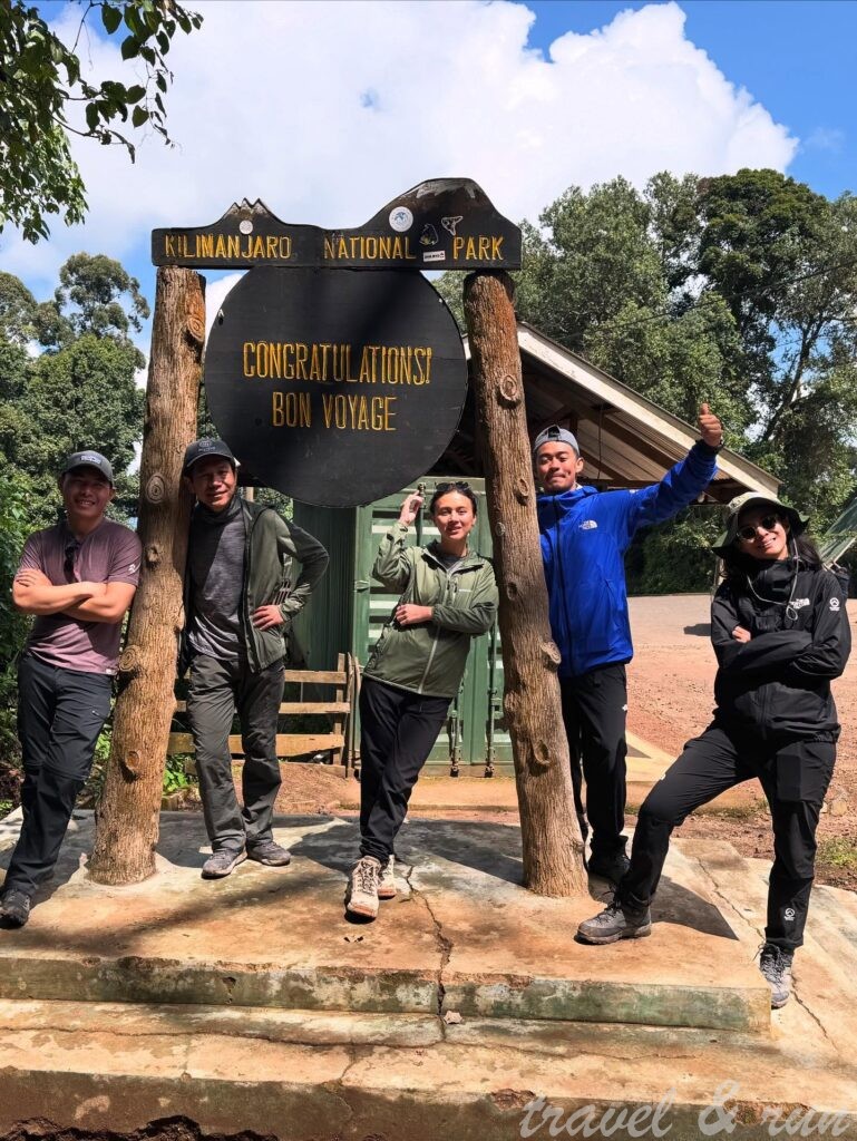 心情愉悅的大家就這樣邊走邊聊,大約 11:00 到達關口 Mweka Gate (略少於 3hr 時間走了10km)。回到文明的懷抱,心情完全不一樣。這裡有的小賣店可以買點紀念品 (當然,山下會更便宜,不一定要在這邊買),旁邊有涼亭,公園管理處。大家稍事休息,就聽到原方隔壁團的挑夫們開始唱唱跳跳起來了 (有點像是街頭尬舞那樣,有人在中間帶唱帶跳,然後又換下一個人接手,一直唱下去不完)。導遊 Salim幫我們大家去申請了登頂證明後,大家再次拍照留念,然後就驅車下山往這七天最期待的旅館浴室前進。