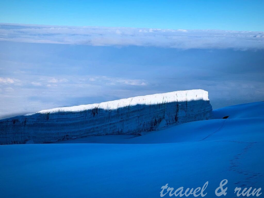 6 ~ 10. 從 Stella Point (5756M)往 Uhuru Peak (5895M)的沿途景色。左下圖是冰雪覆蓋的吉力馬札羅 Kibo火山口。右下圖是非洲大陸上僅存的最後個幾個冰川之一