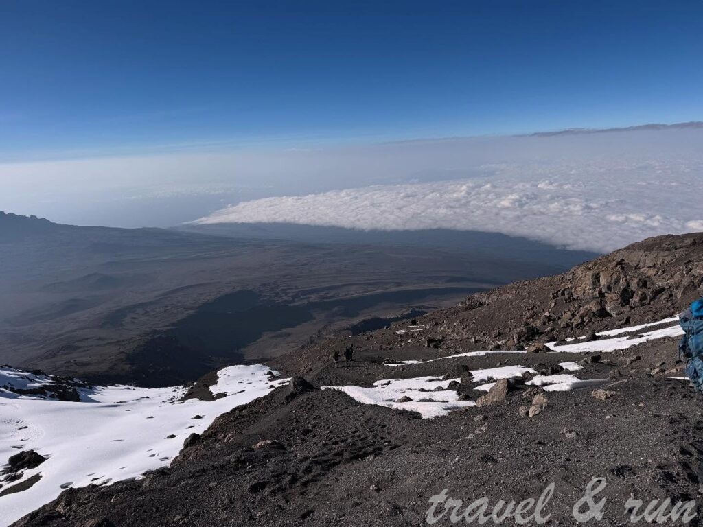 (上圖) 從Stella Point開始,接下來的前半段路徑長這樣,遠方中間偏右一點的遙遠處有個白色小點是我們的營地,下山這段路已經走了好久但這營地看起來還是好遠。還好上山時沒有看到路……