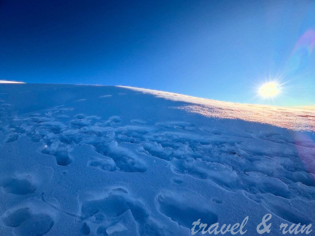 - 將近六個小時後終於天空漸亮,路徑兩側的冰雪漸漸可見