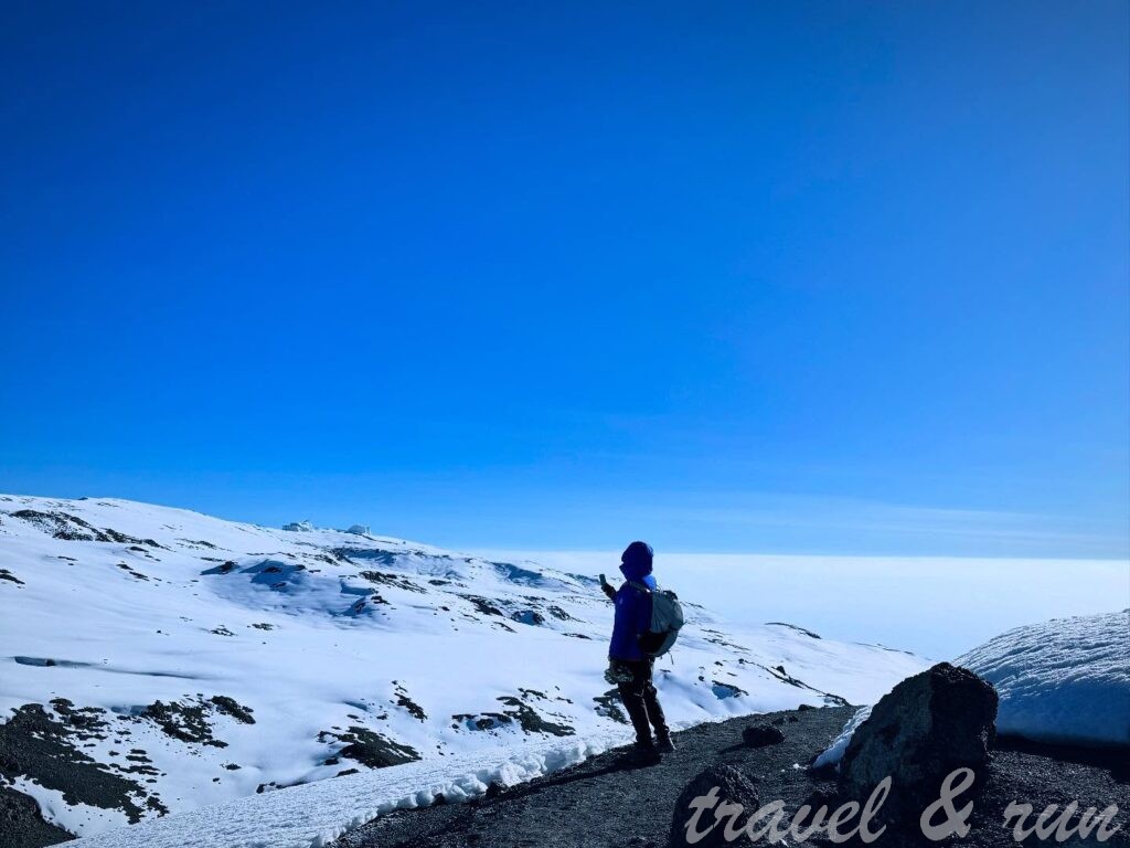- 這是從 Stella point往東邊望,白雪上隱約可以見到另一條上山的路徑 Marangu Route