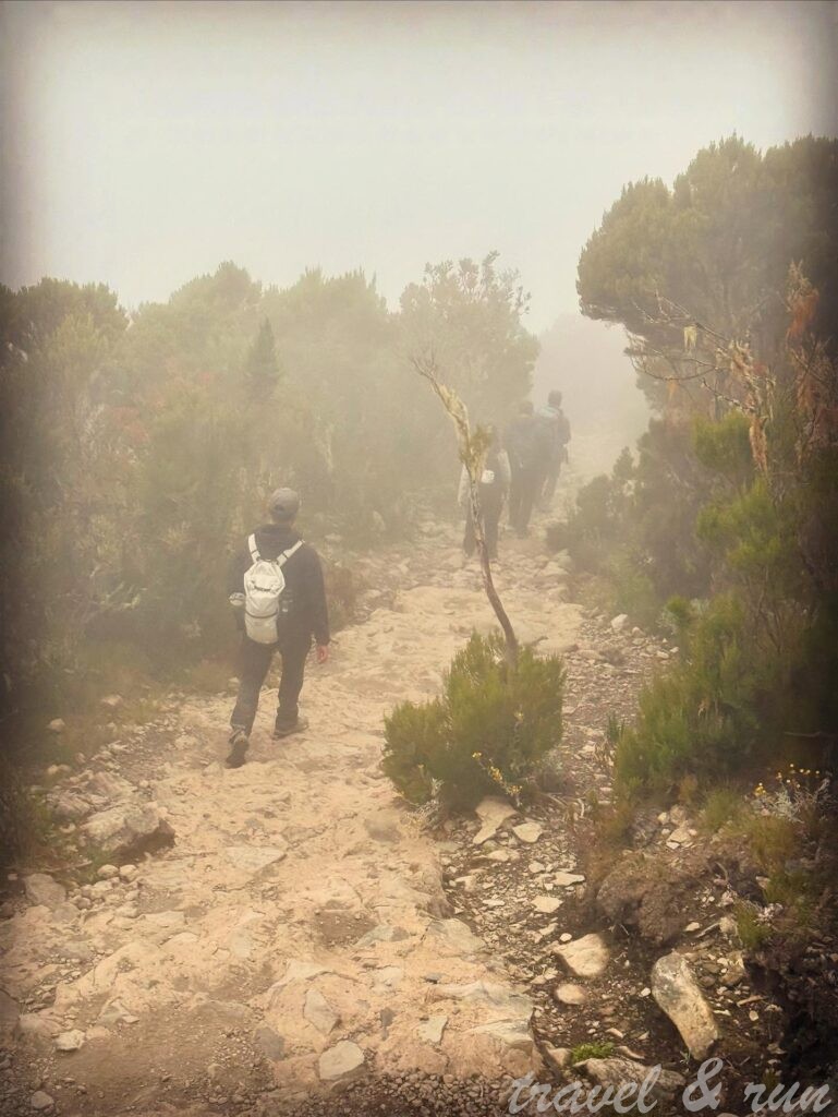 攻頂日經過了行屍走肉般的夜行軍登頂,以及溜滑梯般的碎石下坡大魔王這兩種折磨之後,小睡片刻再起來吃了一頓感謝活著真好的午餐,然後就背起行囊繼續下山了。今天還有大約 7km ( 4hr )的下山路,要從4600M的Barafu Camp下降到 3100M的Mweka Camp。我有問嚮導為何今天要搞得這麼累,不讓我們在這邊睡覺就好。他的解釋是說, Barafu camp畢竟有 4600M,沒水沒遮陰,而且距離山下還有至少 8hr的路程,通常早上雲還沒上來山上,從 Barafu camp (4600M)這邊如果早上六七點出發下山,要一路在沒有任何樹蔭的情況下,曬太陽到中午,然後下午正悶熱也最有可能有午後雷陣雨的情況下,繼續下坡行走最後可能都是泥巴的雨林路徑,這樣最後一天的疲累程度應該跟今天差不多,而且出公園再開車到旅館可能都晚上七八點了。所以在最累人的攻頂日卻還要安排一個下午走 3~4hr其實是很合理的選擇,這樣一來可以避開所有登山客最不想要的沙漠日照、午後大雨、滿地泥濘,二來今天晚上也會睡得比較舒服 (氣溫不會有山頂那麼冷),這樣大家明天早上輕輕鬆鬆就可以出關了。好吧,聽起來也是滿合理,就來吧。