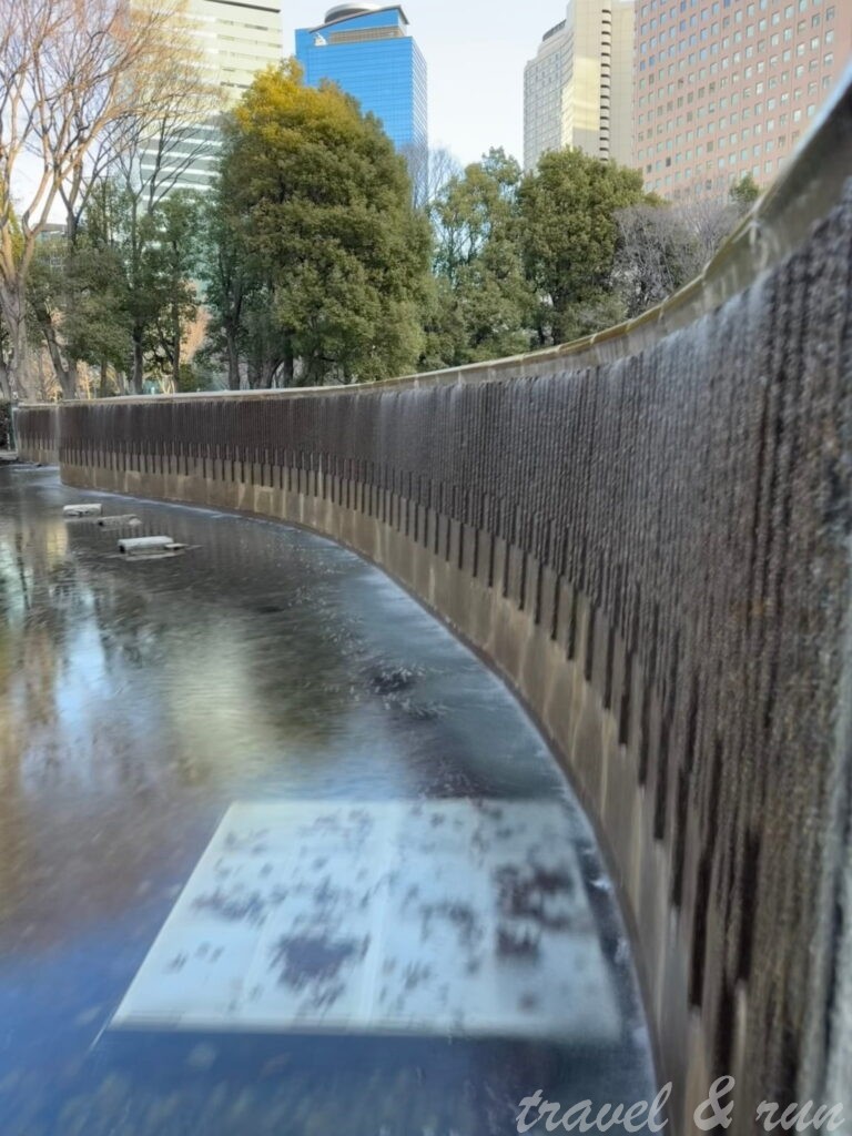 新宿中央公園其實就在人潮洶湧的熱鬧的都廳大樓旁邊。公園還滿大的,中間有一條馬路穿過。今天是禮拜五,跑到這邊的時候已經是有大量的上班族出沒了,需要稍微繞一下人潮躲開。從神田川河邊過來,會從公園的西北側進入,這邊有個十二社熊野神社,規模還不小。照慣例進去參拜了一下,就繼續前進,往南穿過整座公園。這公園來休閒的人還不少,有很多路徑,噴水池、造景、裝置藝術。有時間的可以繞兩圈看看。過了公園到對面商業大樓 新宿公園塔 (Shinjuku Park Tower),有安全且寬闊的人行道可以穿過大樓的腹地,直到最後遇上了中央高速公路的高架橋下,被迫停下來準備過馬路。