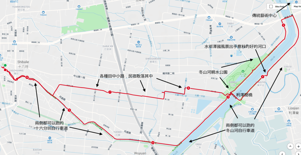 因為大多路徑如果河邊步道,就是田中小路,所以我想應該就貼上路徑圖即可,不用多加說明。田中小路反正只要方向對,要怎麼跑都好。以下,就看圖說故事,並標示出幾個沿途經過的景點地點。其他就不多加說明了。